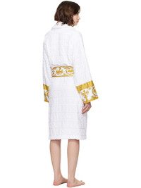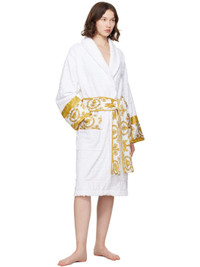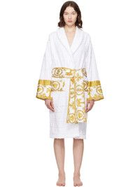 Cotton terrycloth bathrobe. Jacquard logo pattern and Barocco-patterned poplin trim throughout. · Shawl collar · Belt loops with detachable self-tie belt · Patch pockets at waist Supplier color: White 100% cotton. Made in Italy 252404F077003