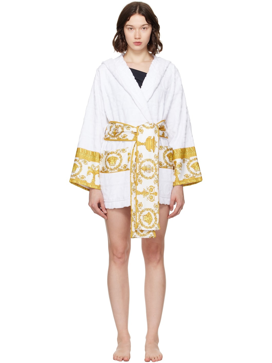 Cotton terrycloth bathrobe. Jacquard logo pattern and Barocco-patterned poplin trim throughout. · Shawl collar · Belt loops with detachable self-tie belt · Patch pockets at waist Supplier color: White 100% cotton. Made in Italy 252404F077009