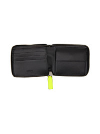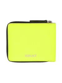 Rubberized zip-around bifold wallet in yellow. Signature Medusa graphic hardware at face. · Silver-tone logo stamp at back face · Three card slots · Two patch pockets · One coin pouch · One note slot · Buffed calfskin interior · Nylon twill lining · H3.75 x W4.5 x D0.75 in Supplier color: Fluorescent yellow/Ruthenium