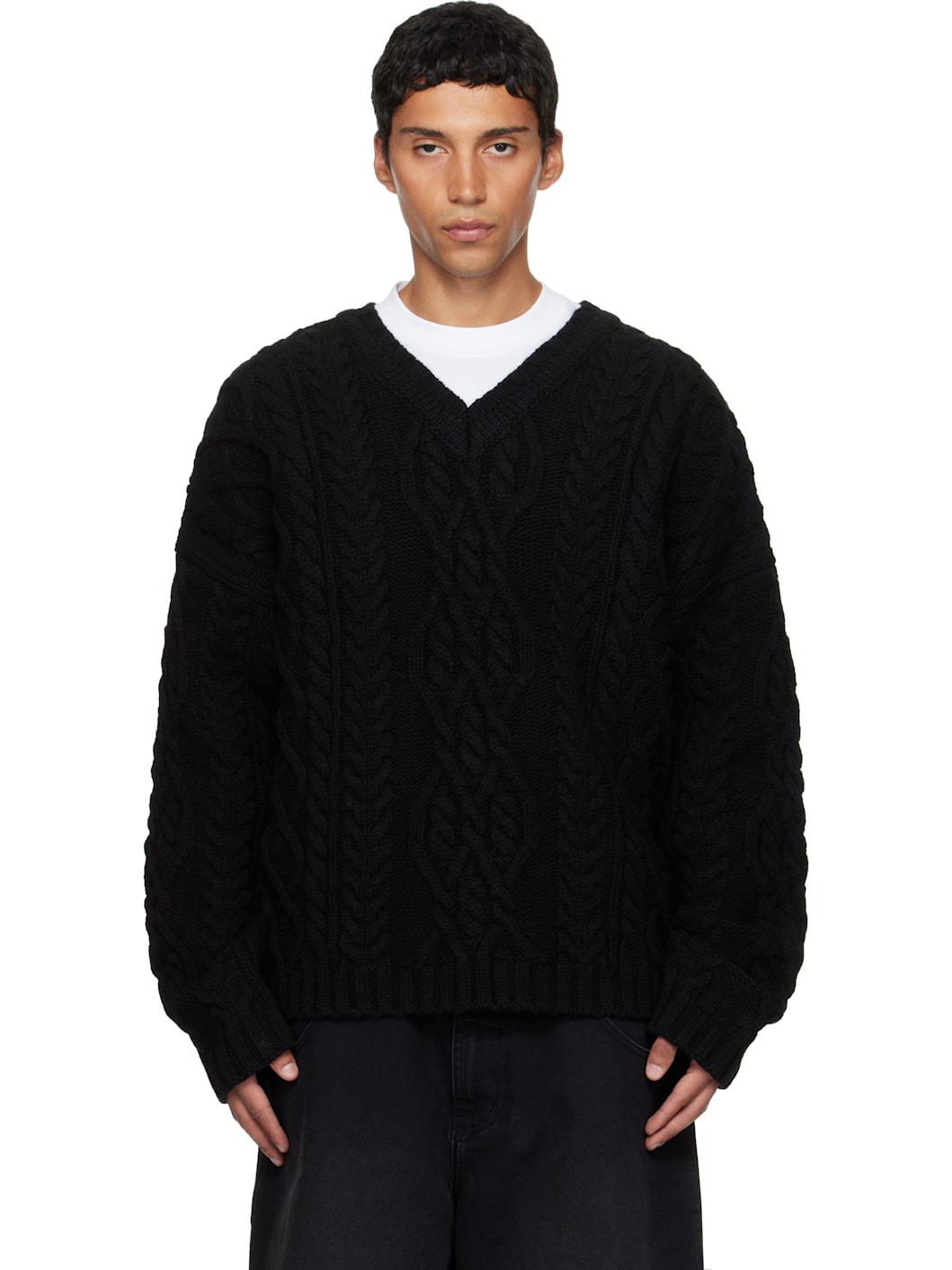 Cable-knit wool sweater. · Rib-knit V-neck, hem, and cuffs · Dropped shoulders · Rubberized logo patch at back collar Supplier color: Black 100% wool. Made in Italy 252669M201001