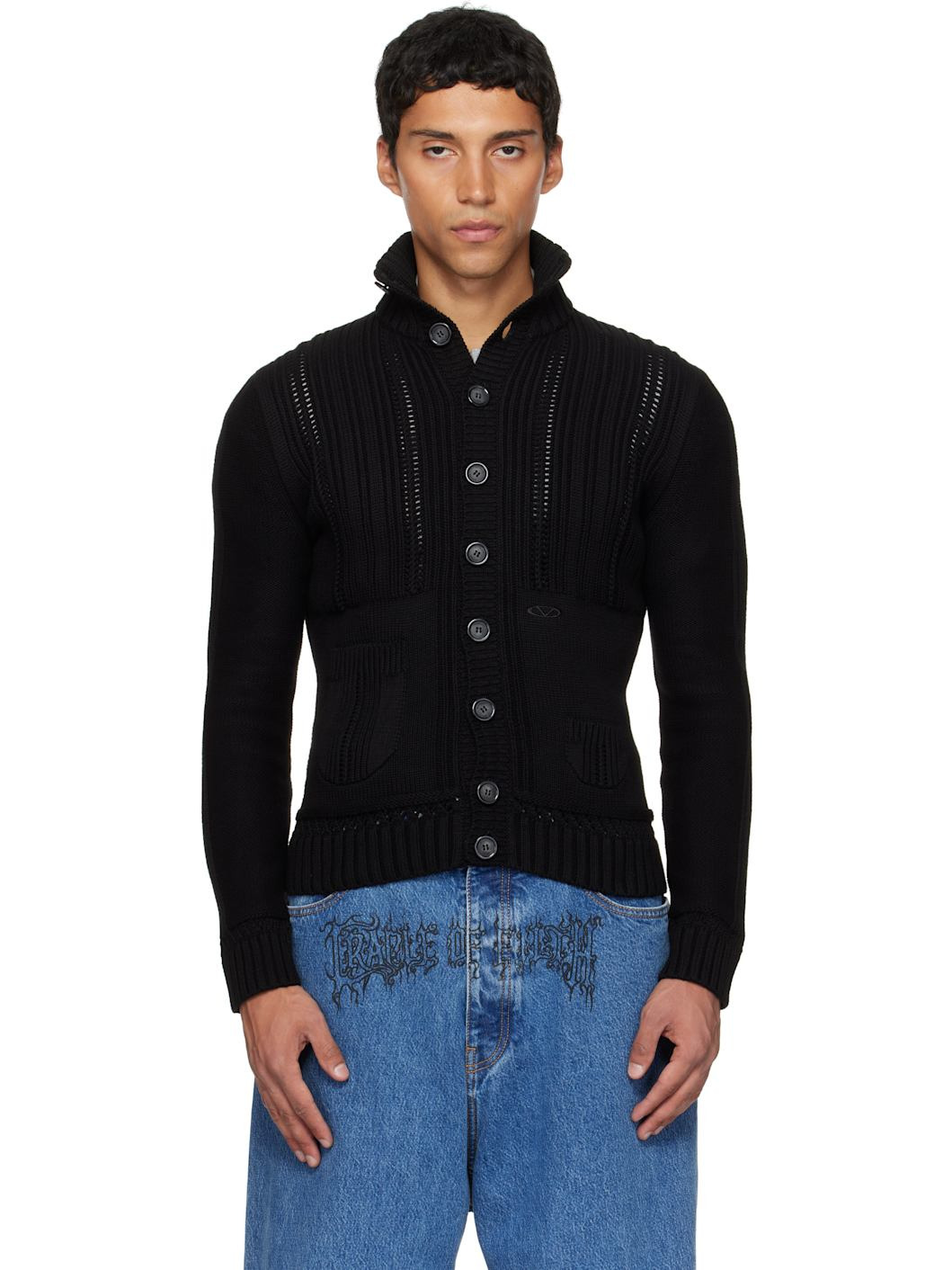 Rib-knit cotton cardigan. · Stand collar · Button closure · Embroidered logo and patch pockets at front Supplier color: Black 100% cotton. Made in Italy 252669M200003