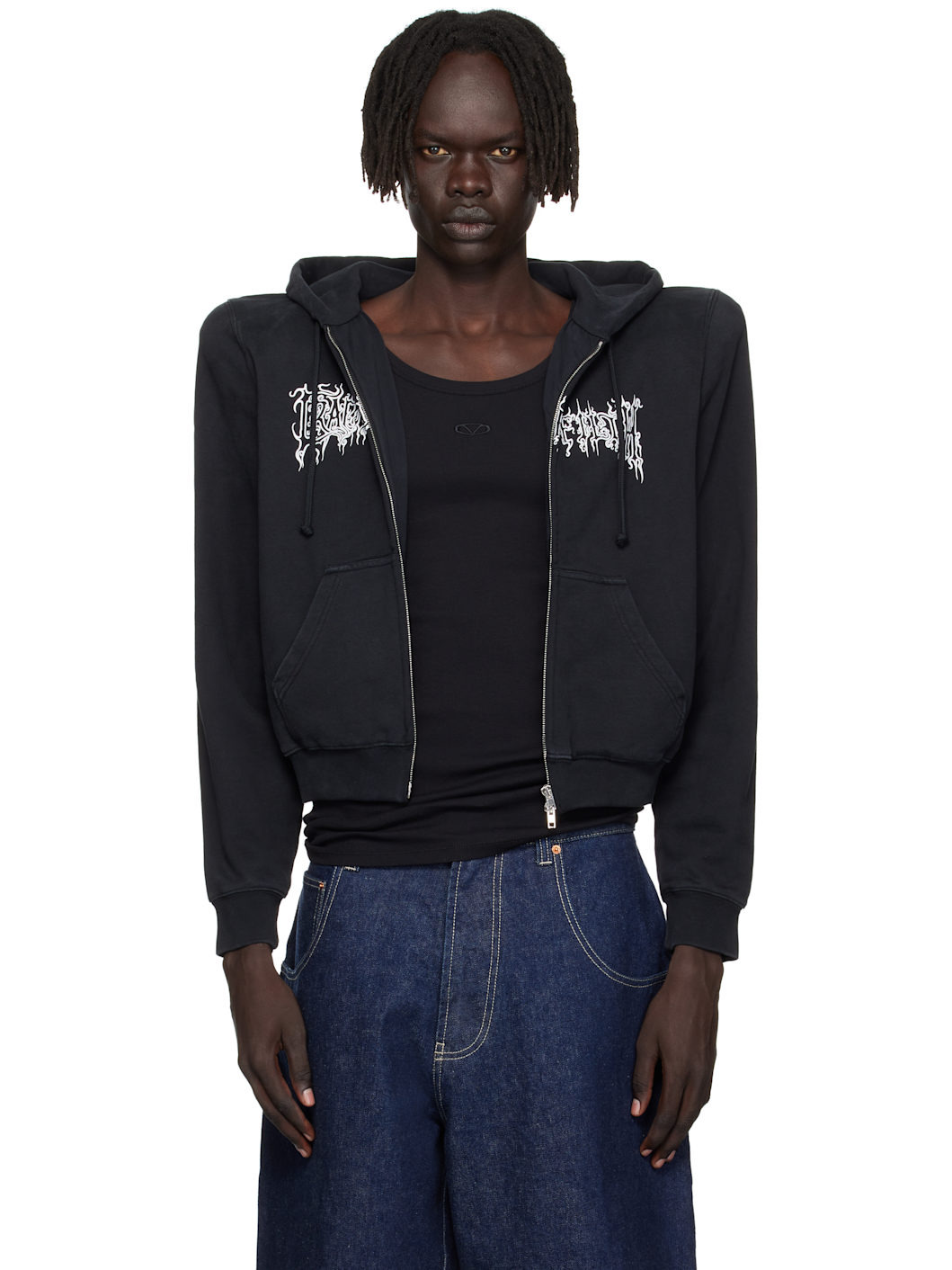 Cotton French terry hoodie. · Drawstring and embroidered logo at hood · Two-way zip closure · Text printed at front · Patch pockets at waist · Cropped hem · Rib-knit hem and cuffs · Padded shoulders · Full jersey lining Part of the Cradle of Filth capsule. Supplier color: Washed black Body: 100% cotton. Trim: 96% cotton, 4% elastane. Lining: 100% cotton. Made in Portugal 252669M202000