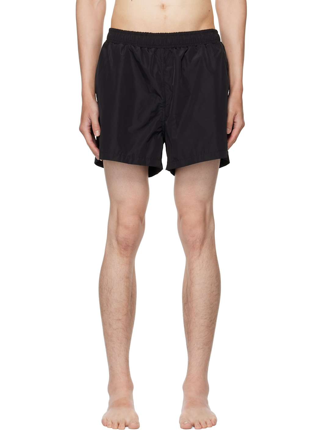 Polyester taffeta swim shorts. · Drawstring at elasticized waistband · Three-pocket styling · Graphic printed at front hem · Vented side seams · Logo embroidered at back pocket · Full mesh brief-style lining Supplier color: Black Body: 100% polyester. Lining: 95% polyester, 5% elastane. Made in Italy 252669M208000