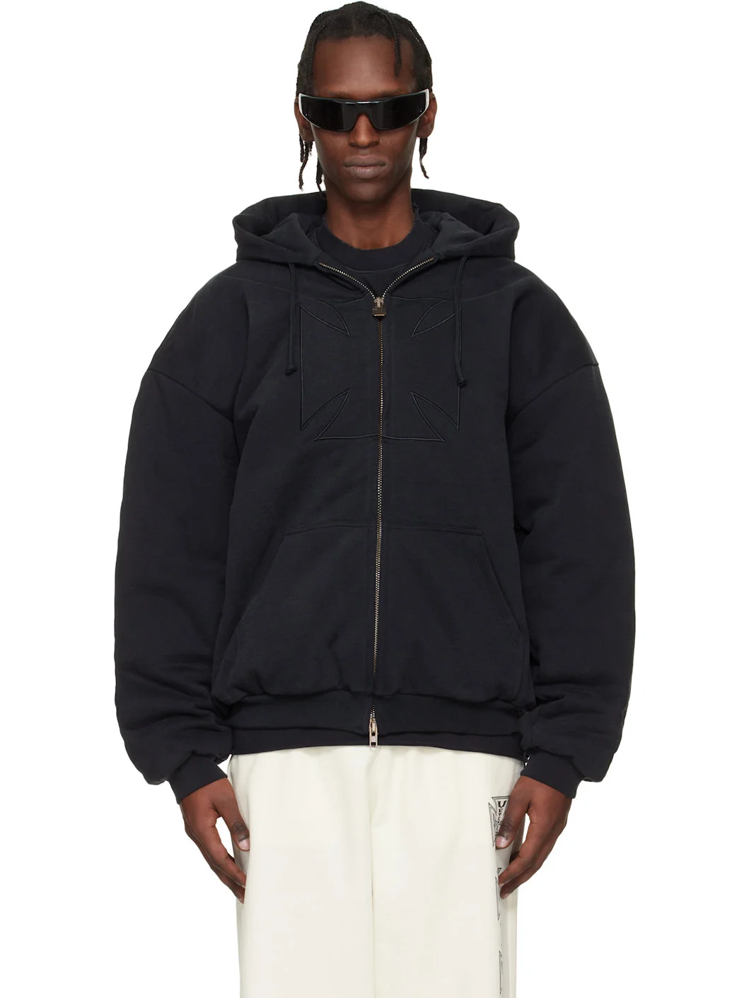Black Embroidered Cross Padded Zip-Up Hoodie