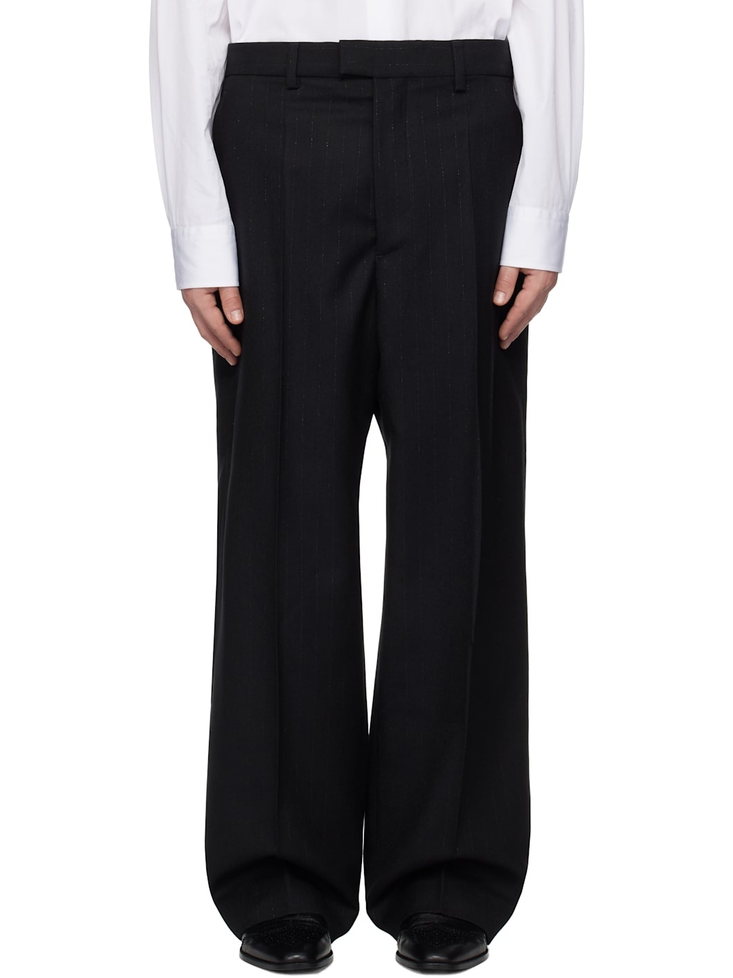 Virgin wool- and cupro-blend gabardine trousers. Metallic thread pinstripes throughout. · Belt loops · Four-pocket styling · Zip fly · Creased legs · Notch at back waistband Supplier color: Black Body: 97% virgin wool, 2% cupro, 1% polyester metallic. Lining: 100% viscose. Made in Italy 251669M191000