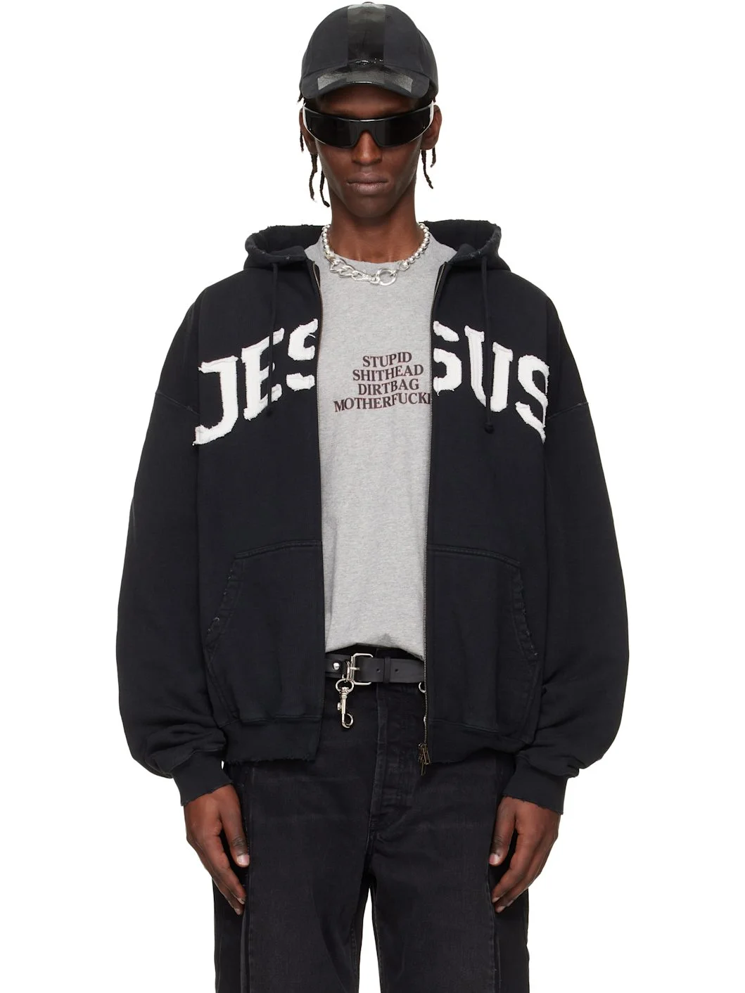 French terry hoodie. · Distressing throughout · Drawstring and embroidered logo at hood · Zip closure · Text appliques at front and back · Patch pockets at front · Rib-knit hem and cuffs · Dropped shoulders Supplier color: Washed-out black 80% cotton, 20% polyester. Made in Portugal 261669M202009