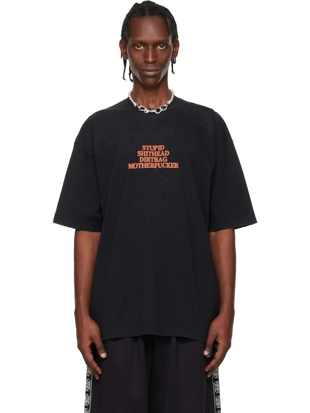 Cotton jersey T-shirt. · Sistressing at rib-knit crewneck, hem, and cuffs · Text printed at chest and back · Dropped shoulders · Logo embroidered at back collar Supplier color: Black Body: 100% cotton. Trim: 97% cotton, 3% elastane. Made in Portugal 261669M213016