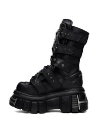 Mid-calf buffed leather boots in black. · Pyramid studs and graphic rivets throughout · Graphic hardware at toe and heel · Graphic logo plaques at vamp · Velcro closure · Cinch strap at vamp · Padded layered tongue · Rubberized trim and logo at heel counter · Grained leather lining · Graphic platform rubber midsole · Treaded rubber sole · Logo-engraved silver-tone hardware · Platform: H3.25" Part of the VETEMENTS X New Rock collaboration. Supplier color: Black