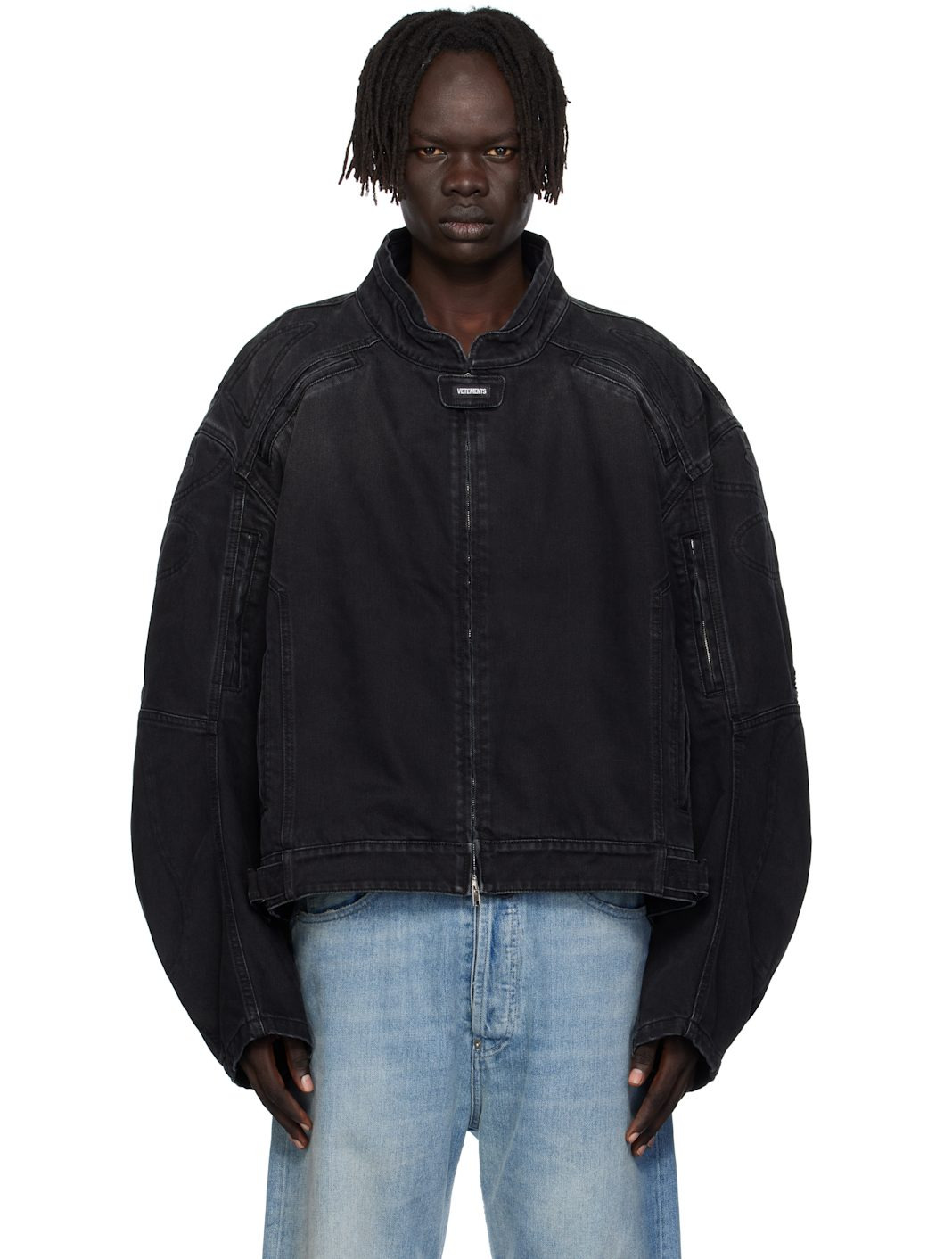 Non-stretch denim jacket. · Fading throughout · Stand collar · Zip closure · Zip pocket at chest · Welt pockets at waist · Velcro tabs at hem · Quilted saddle shoulders · Embroidered logo patch at sleeves · Rubber logo patch at back collar Supplier color: Vintage black 100% cotton. Made in Italy 252669M177002
