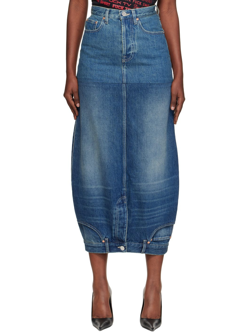 Non-stretch denim midi skirt. · Fading and whiskering throughout · Paneled construction · Belt loops · Five-pocket styling · Button fly · Belt loops and button vent at hem · Logo patch at back waistband and hem · Central vent at back hem · Contrast stitching in white Supplier color: Blue/Navy Body: 100% cotton. Trim: 65% cotton, 35% polyester. Made in Italy 252669F093000