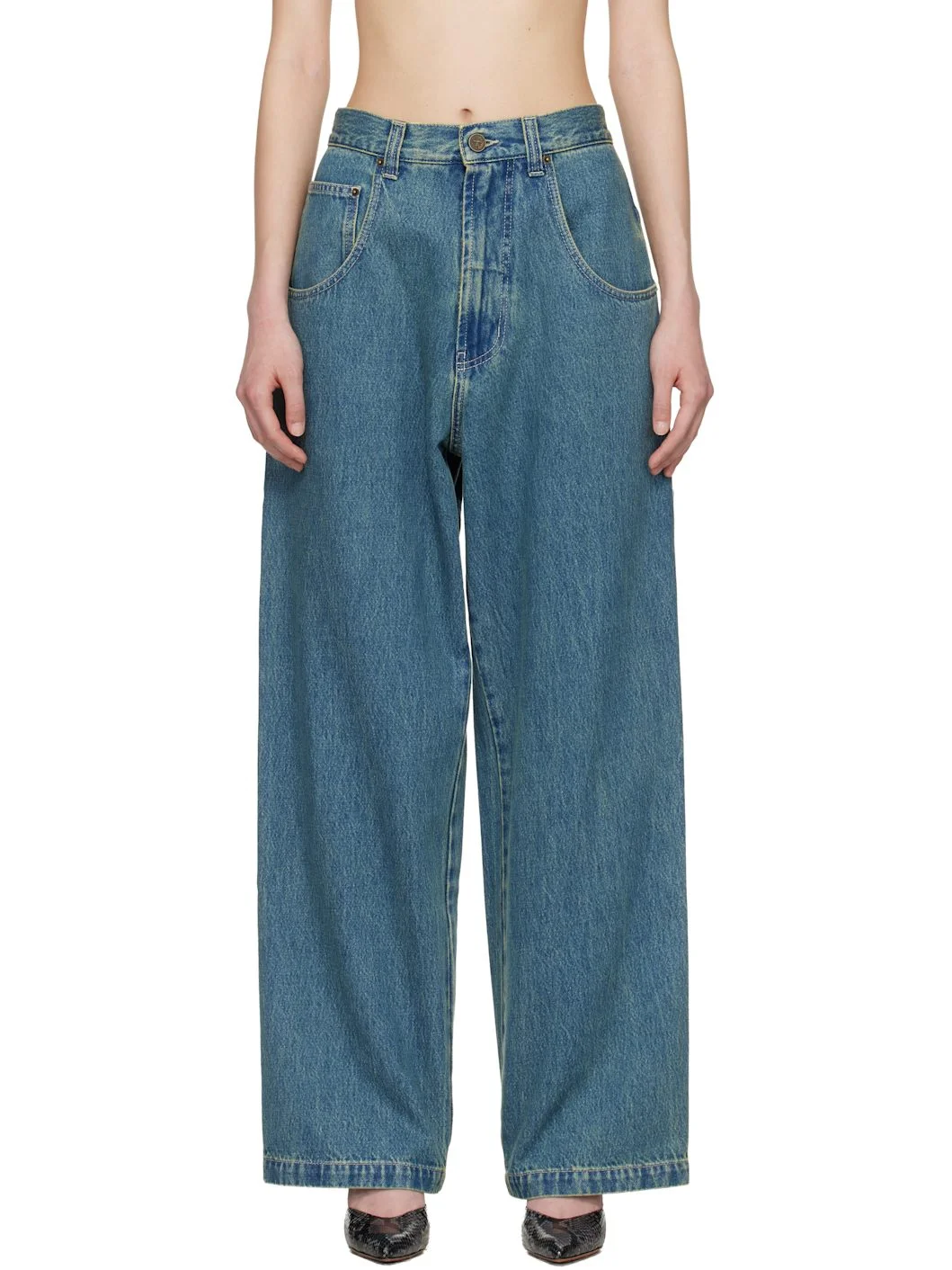 Non-stretch denim jeans · Fading throughout · Belt loops · Five-pocket styling · Zip fly · Hammer loop at outseam · Patch pockets with embroidered logo at outseam · Logo-engraved antiqued gold-tone hardware Supplier color: Vintage mid blue Body: 100% cotton. Trim: 65% polyester, 35% cotton. Made in Italy 261669F069003