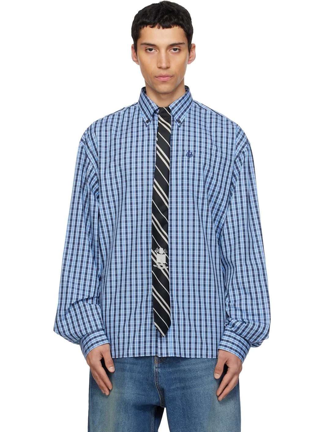 Plain-woven cotton shirt. Integrated striped satin tie with embroidered logo at placket. · Check pattern throughout · Button-down spread collar · Button closure · Logo embroidered at patch pocket · Shirttail hem · Buttoned barrel cuffs · Box pleat at back yoke Supplier color: Navy check Body: 100% cotton. Trim: 100% polyester. Made in Portugal 261669M192005