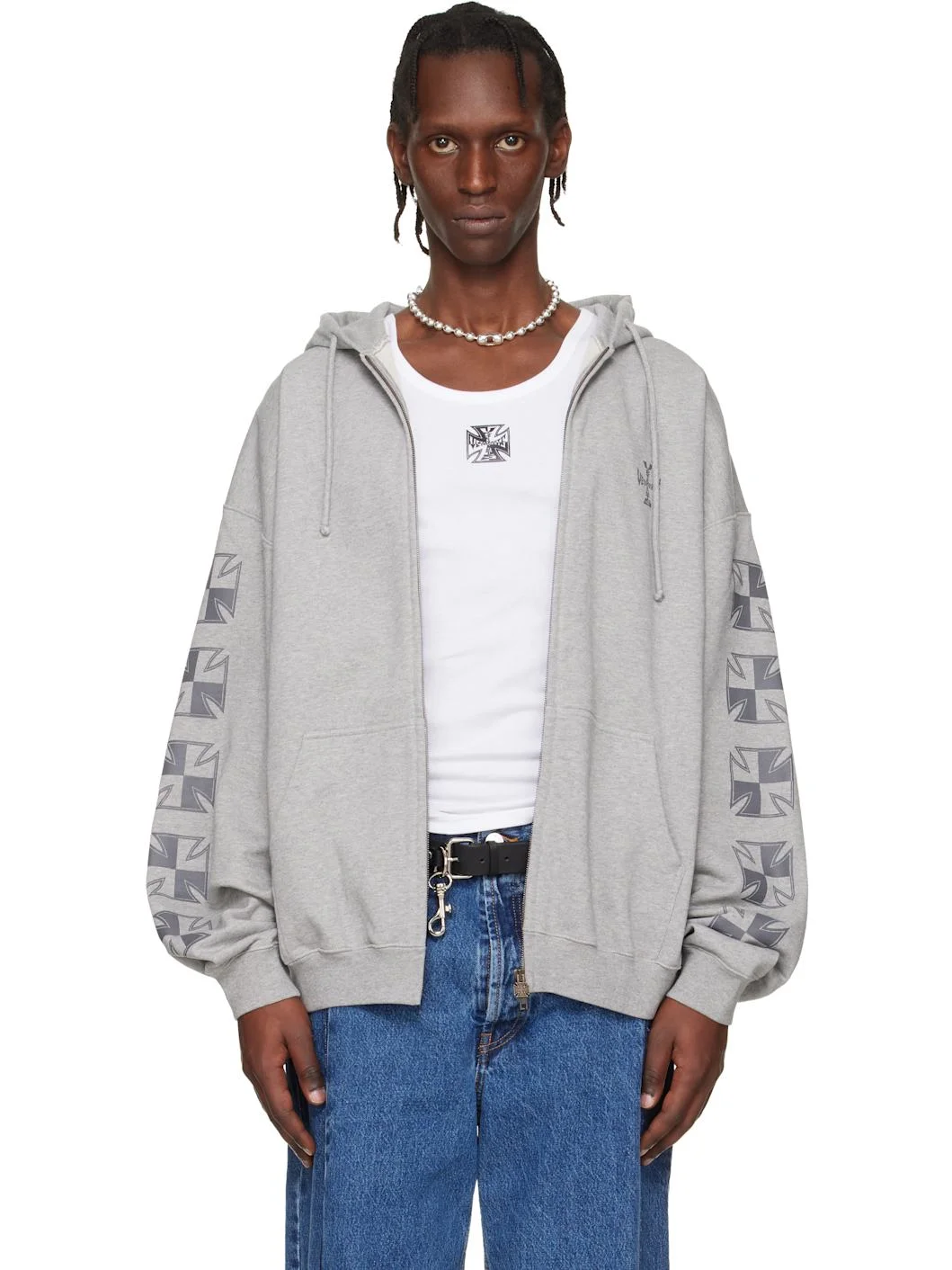 Gray Biker Cross Sleeves Zip-Up Hoodie