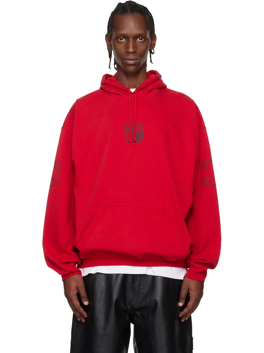 Cotton-blend French terry hoodie. · Embroidered logo and drawstring at hood · Logo graphic printed at chest · Kangaroo pocket at front · Rib-knit hem and cuffs · Dropped shoulders · Graphic printed at sleeves Supplier color: Red Body: 80% cotton, 20% polyester. Trim: 74% cotton, 24% polyester, 2% elastane. Made in Portugal 261669M202018
