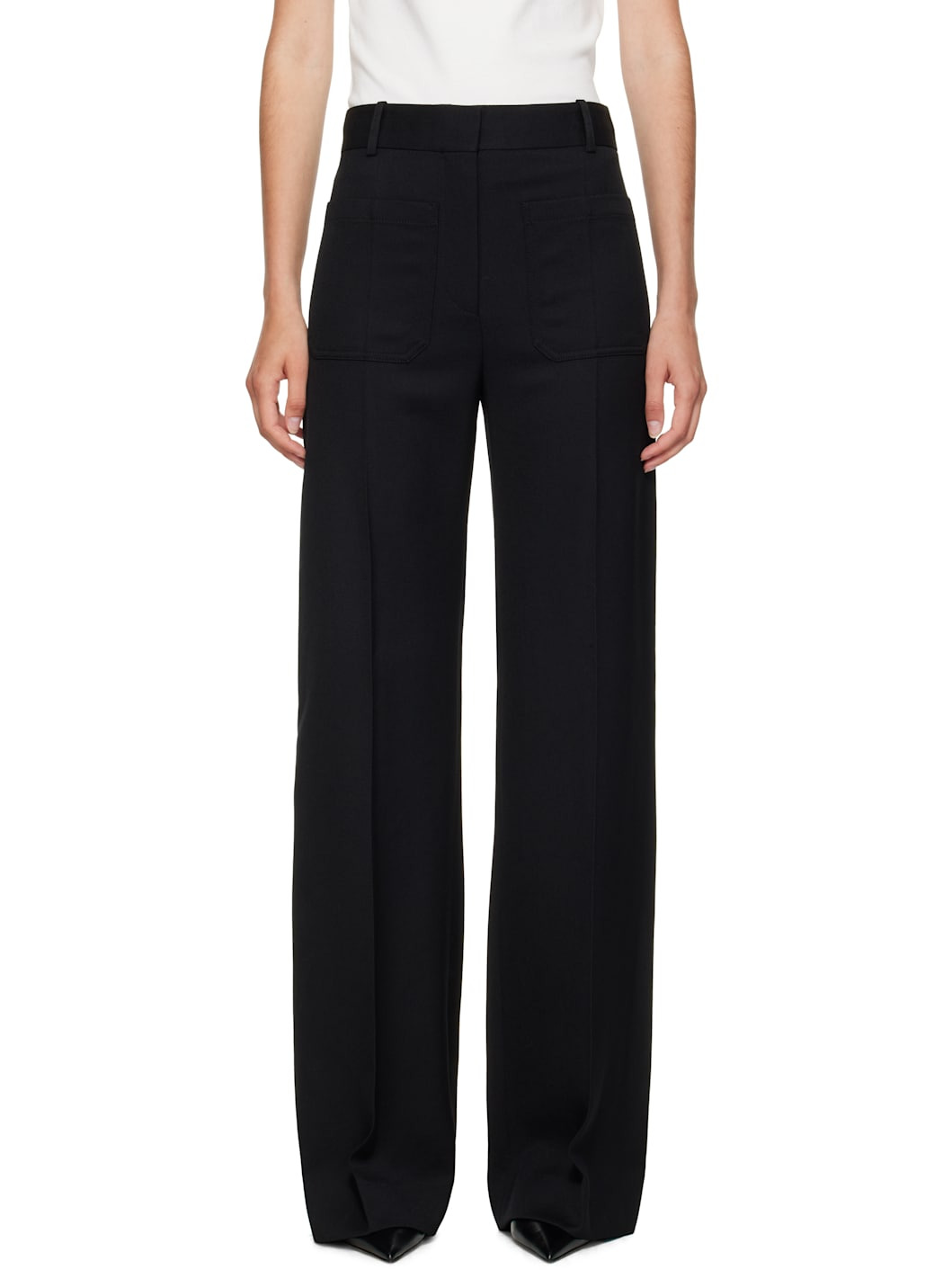 Virgin wool-blend grain de poudre trousers. · Flared leg · High-rise · Belt loops · Four-pocket styling · Zip fly · Creased legs Supplier color: Black Body: 55% polyester, 45% virgin wool. Pocket lining: 70% cotton, 20% polyamide. Made in Portugal 252784F087001