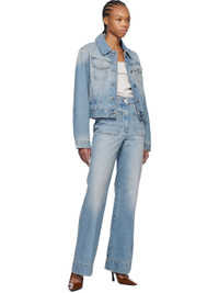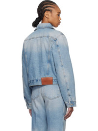 Loose-fit non-stretch denim jacket. Fading throughout. · Spread collar · Flap and welt pockets · Button closure · Cropped hem · Single-button cuffs · Leather logo patch at back hem · Full quilted satin lining · Logo-engraved silver-tone hardware · Contrast stitching in beige Supplier color: Pale blue wash Body: 100% cotton. Trim: 100% leather. Lining: 100% polyester. Made in Italy 251784F060000