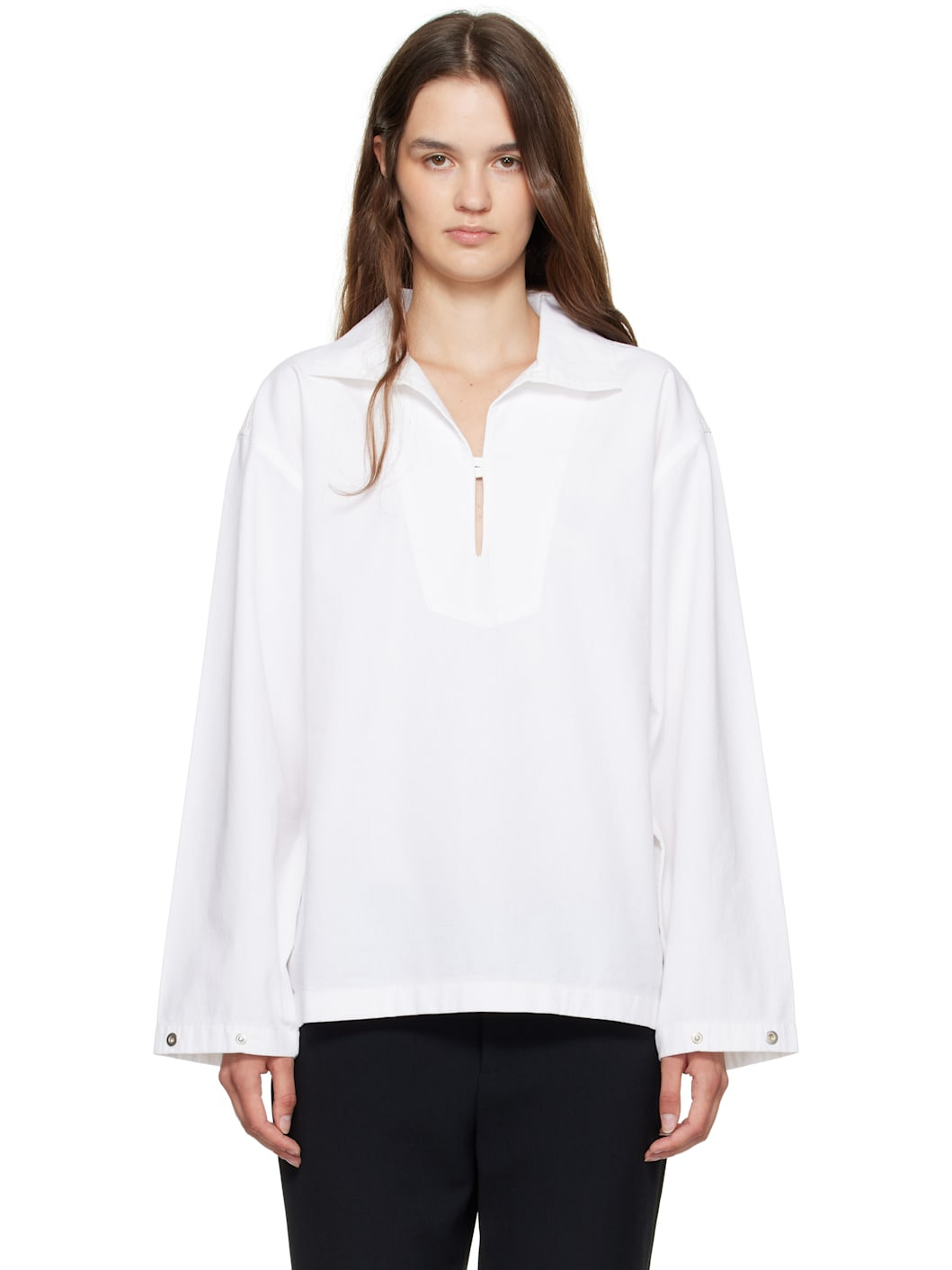Non-stretch denim blouse. · Open spread collar · Button tab at chest · Dropped shoulders · Press-stud tab at cuffs · Contrast stitching in brown at back yoke Supplier color: Washed white 100% cotton. Made in Italy 252784F107001