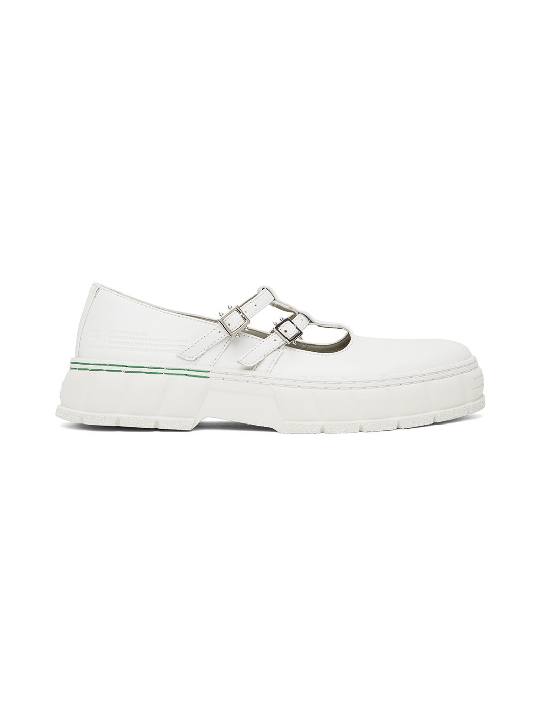 Handcrafted Appleskin™ faux-leather Mary Jane-style loafers in white. · PETA-certified · Adjustable pin-buckle straps at vamp · Text embossed at outer side · Logo embossed at heel · Logo printed at padded insole · Grained faux-leather lining · Textured recycled rubber-blend sole · Contrast stitching in green Supplier color: White Upper: synthetic. Sole: rubber, recycled rubber. Made in Portugal 242589M231009