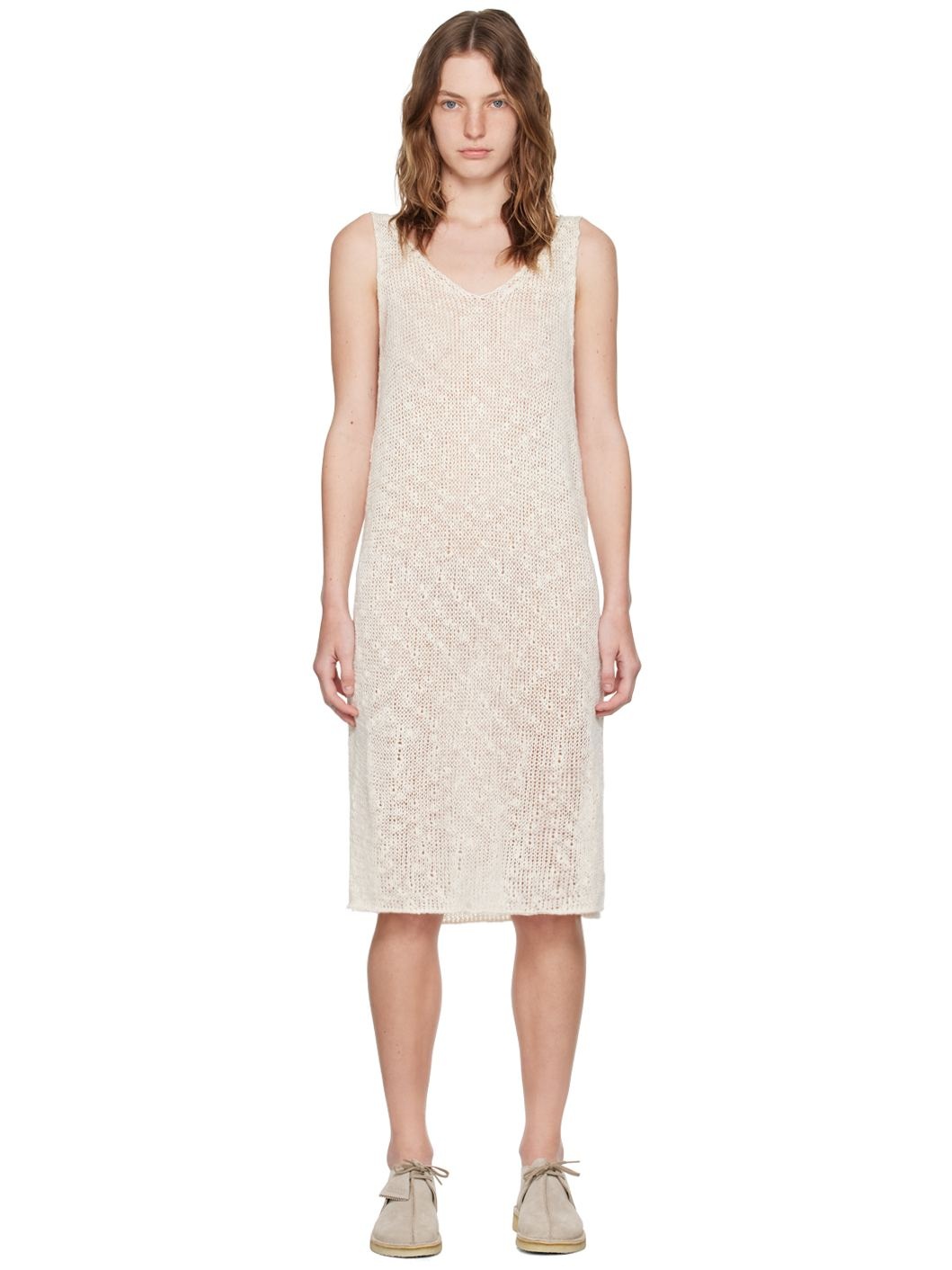 Open knit silk- and cotton-blend dress. · V-neck · Vented side seams · Rolled edge at hem Supplier color: Ivory 57% silk, 43% cotton. Made in Japan 241487F054004