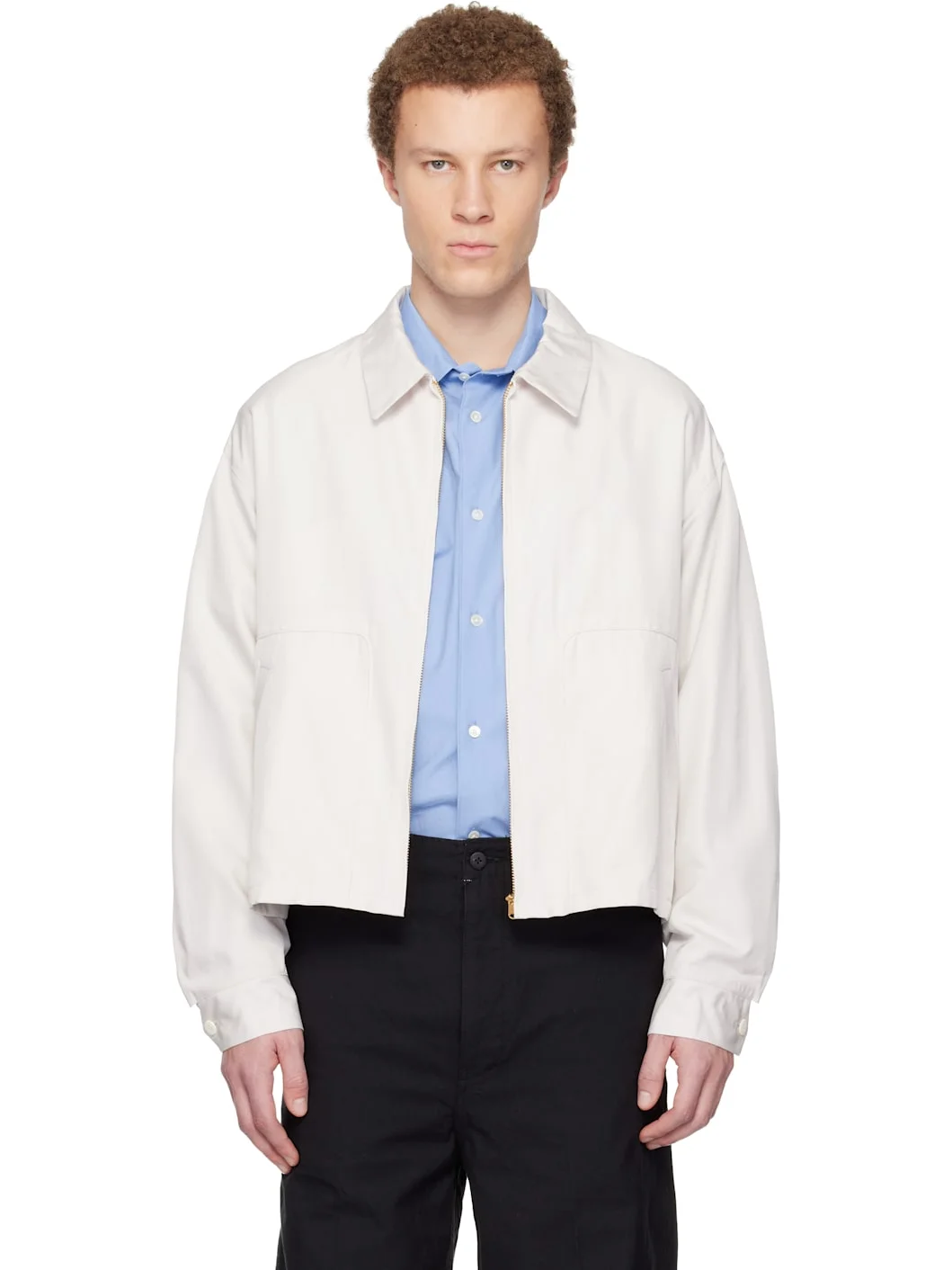 Wool- and silk-blend twill jacket. · Spread collar · Zip closure · Welt pockets at front · Adjustable buttoned barrel cuffs · Logo and text printed at back · Welt pockets at interior · Full satin lining · Horn hardware Supplier color: Off white Body: 62% wool, 38% silk. Trim: 100% cotton. Lining: 100% rayon. Made in Japan 261487M180004