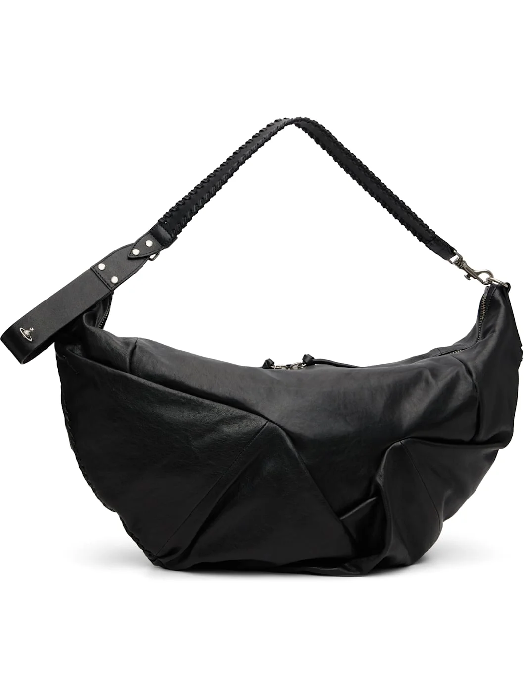 Grained sheepskin shoulder bag. · Pleats and darts throughout · Adjustable and detachable crossbody strap · Whipstitching at strap · Carry handle with logo hardware at strap base · Two-way zip closure · Patch and zip pocket at interior · Canvas lining · H16" x W24" Supplier color: Black Sheepskin. Made in Italy 261314M170056