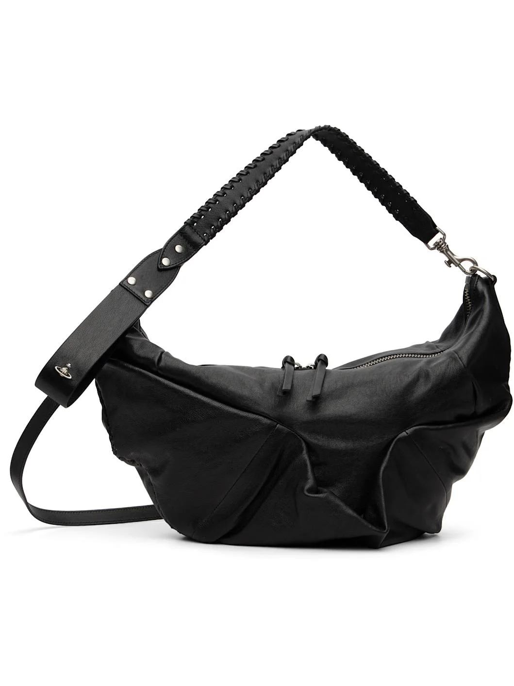 Grained sheepskin messenger bag. · Paneled construction with pleats throughout · Adjustable and detachable crossbody strap · Detachable shoulder strap with wristlet · Whipstitching at curved base · Two-way zip closure · Patch and zip pocket at interior · Twill lining · H13" x W18" x D3" Supplier color: Black/Dark silver Sheepskin. Made in Italy 261314M170055