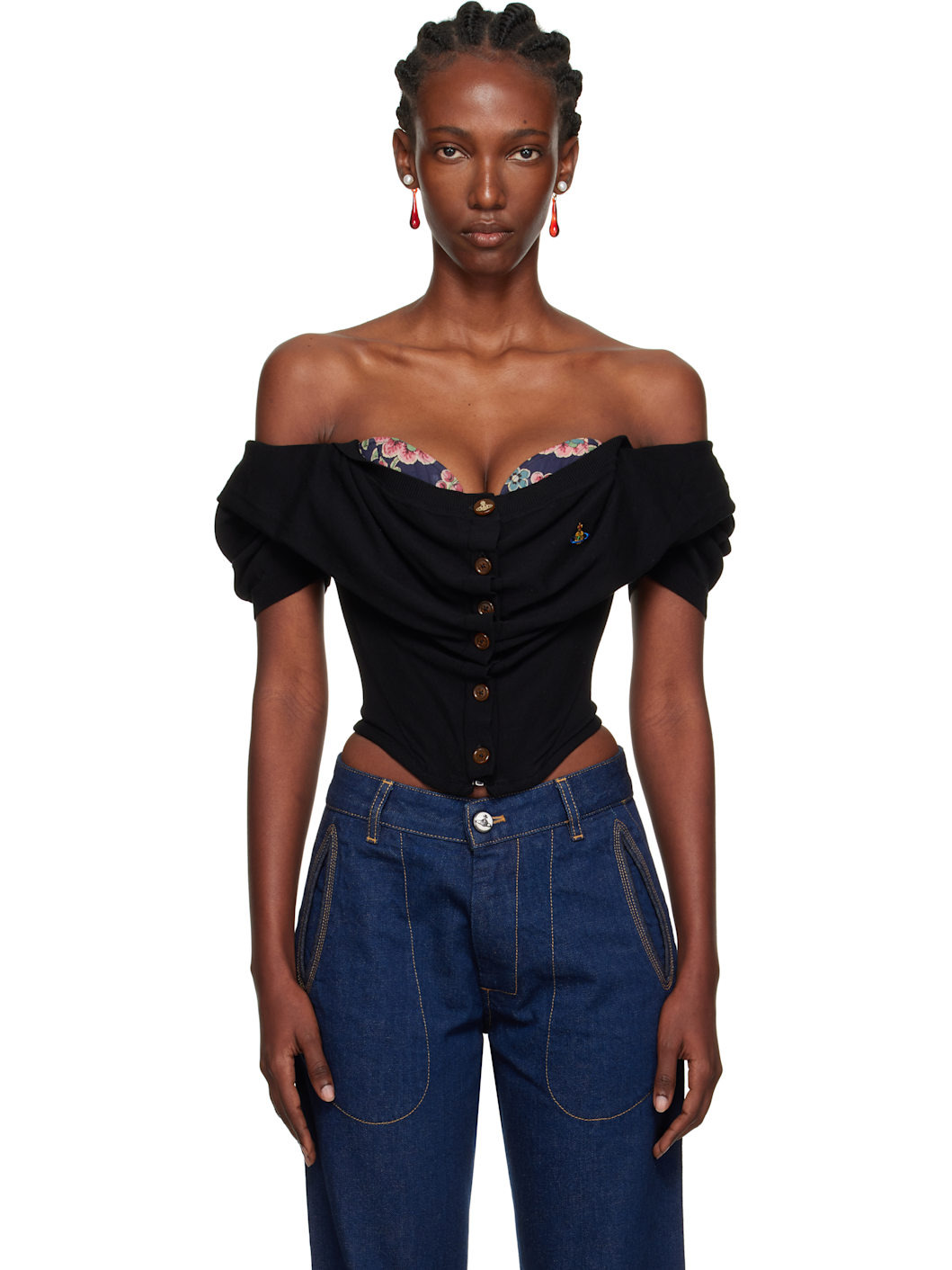 Knit cotton and stretch twill cardigan. · Layered construction · Rib-knit cowl neck and hem · Zip and button closure · Draping at front · Logo embroidered at chest · Cropped hem · Gigot sleeves · Jacquard floral pattern and boning at corset-style underlay Supplier color: Black Body 1: 100% cotton. Body 2: 77% polyamide, 23% elastane. Made in Italy 251314F095013
