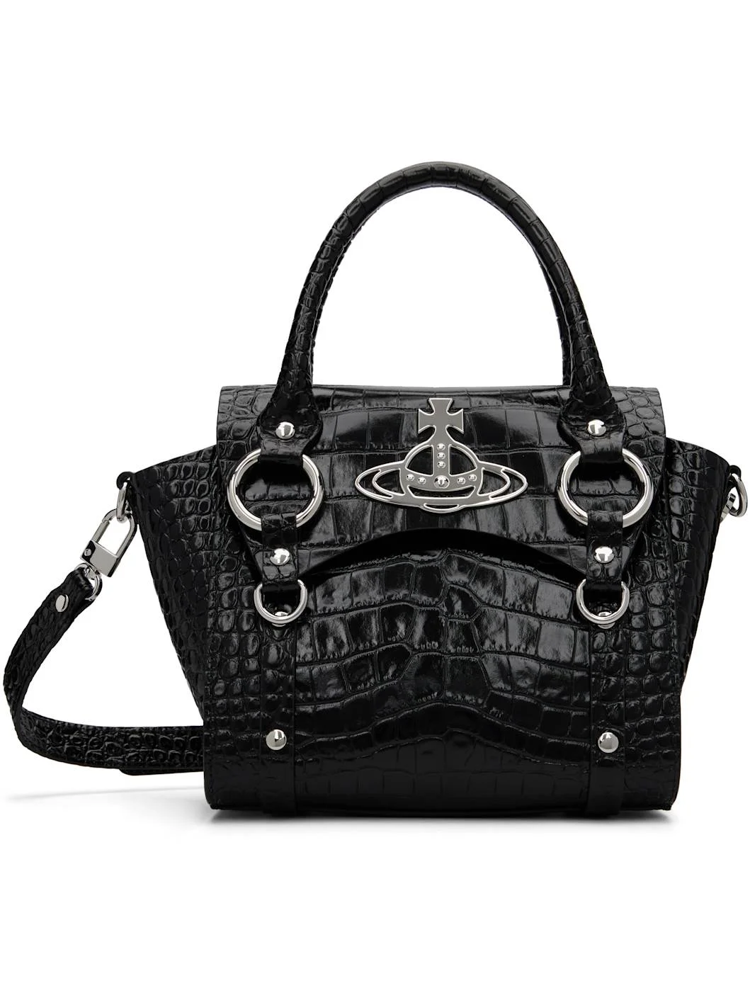 Croc-embossed calfskin top handle bag. · Twin rolled carry handles · Adjustable and detachable shoulder strap · Logo hardware at face · D-rings at face · Bumper studs at base · Magnetic press-stud foldover flap · Zip pocket at interior · Grained leather lining · H8" x W11" x D4.25" Supplier color: Black Calfskin. Made in Italy 252314F046048