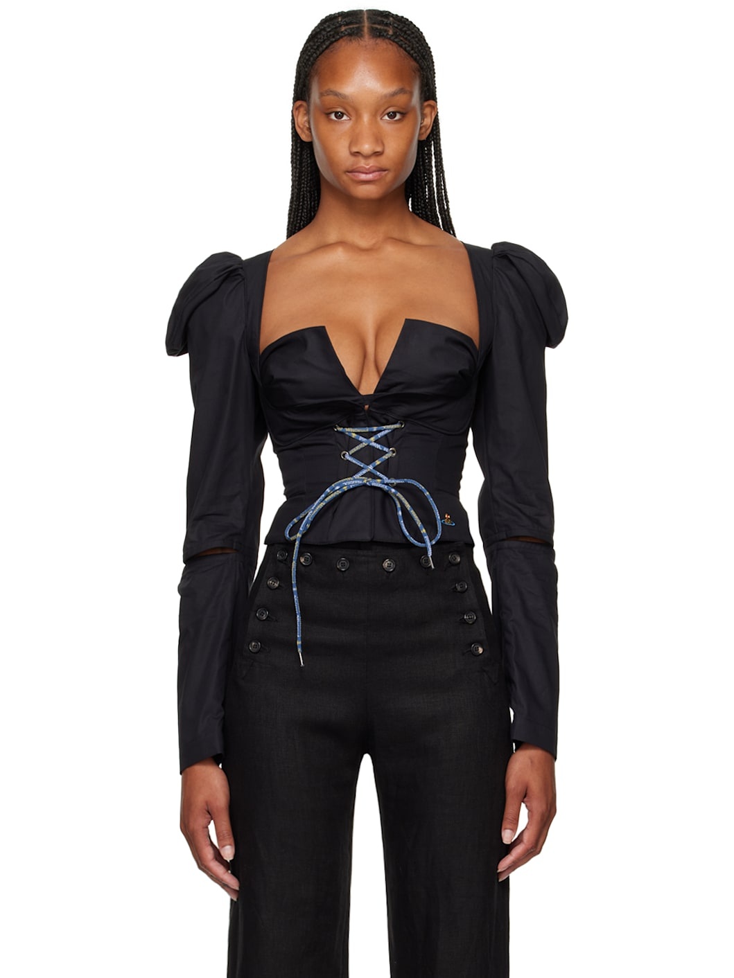 Hand-finished cotton poplin blouse. · Paneled construction · Swwetheart neck · Logo-embroidered lace-up detailing at front · Princess seams at front and back · Logo embroidered at hem · Puff sleeves · Cutout at sleeves Supplier color: Black 100% cotton. Made in Italy 242314F107001