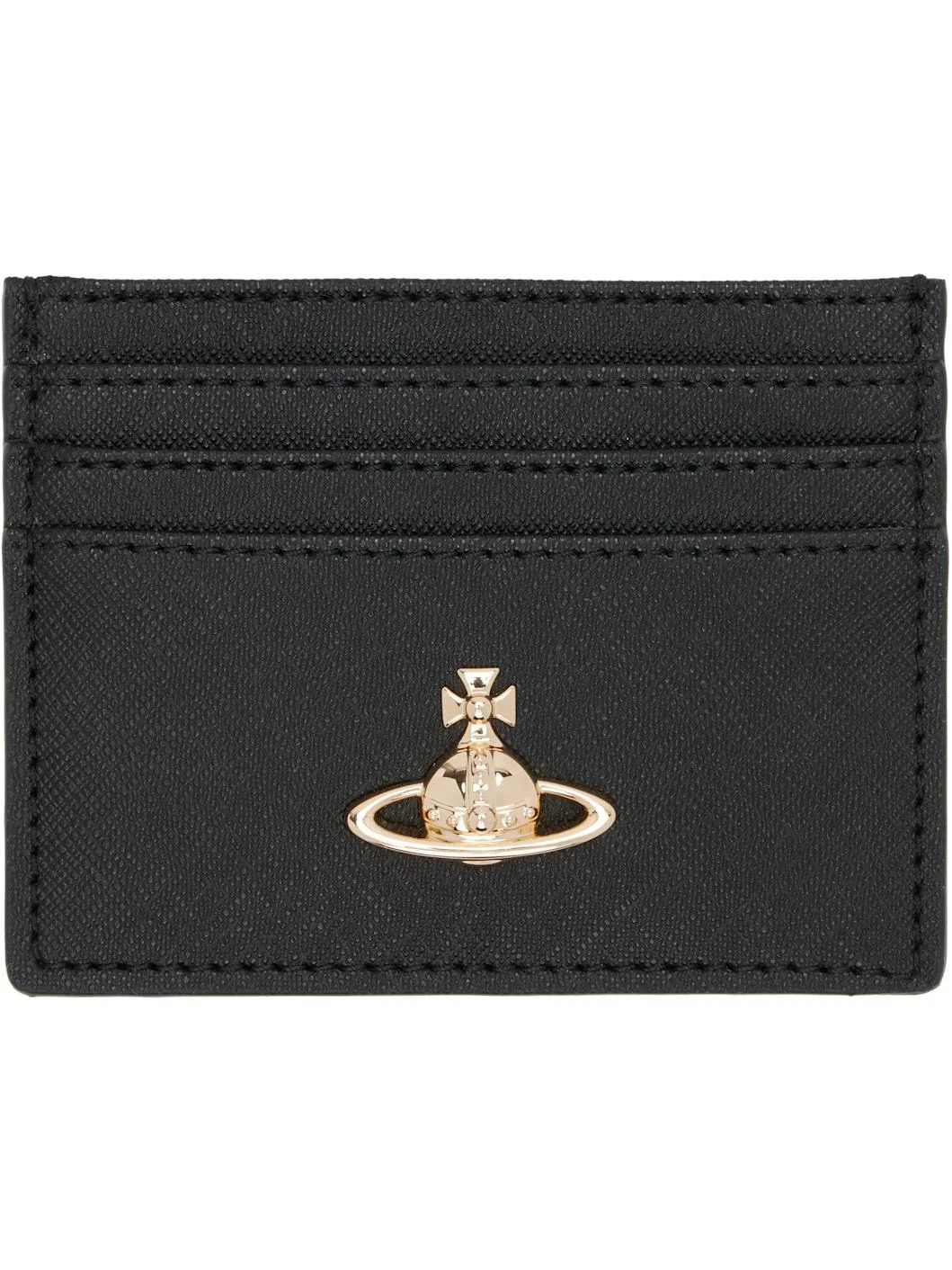 Saffiano faux-leather card holder. · Logo hardware at face · Four card slots · Central note slot · Twill lining · Gold-tone hardware · H3" x W4" Supplier color: Black 3d orb Synthetic. Made in Italy 252314M163008