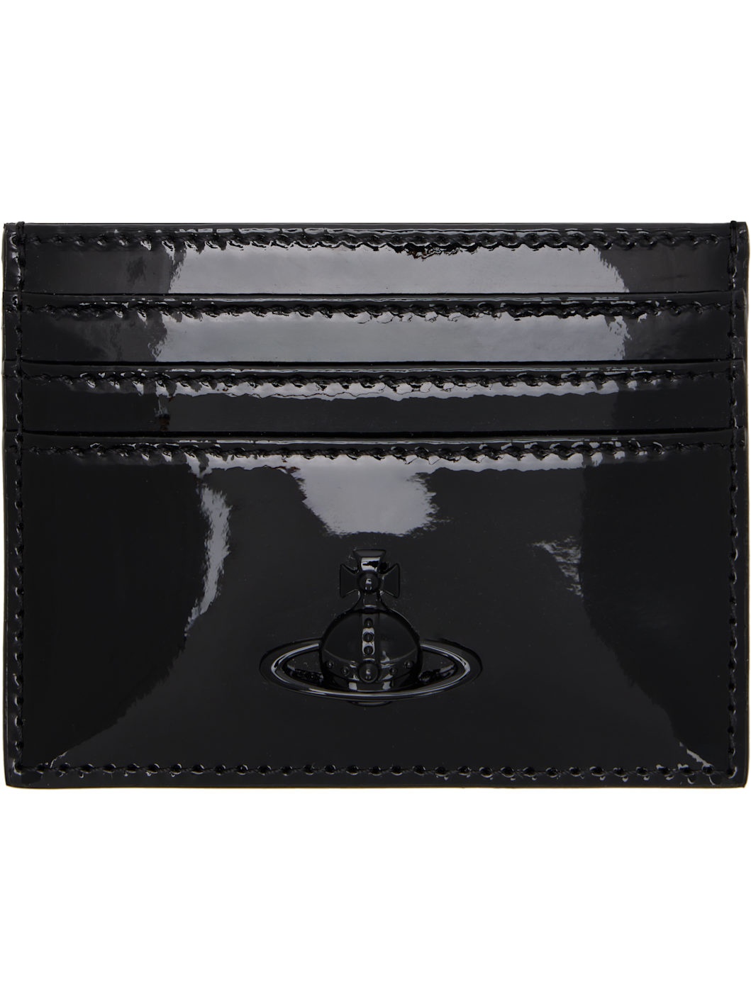Patent leather card holder in black. - Enameled logo hardware at face - Four card slots - Central note slot - Twill lining - H3 x W4 Supplier color: Black enamel orb