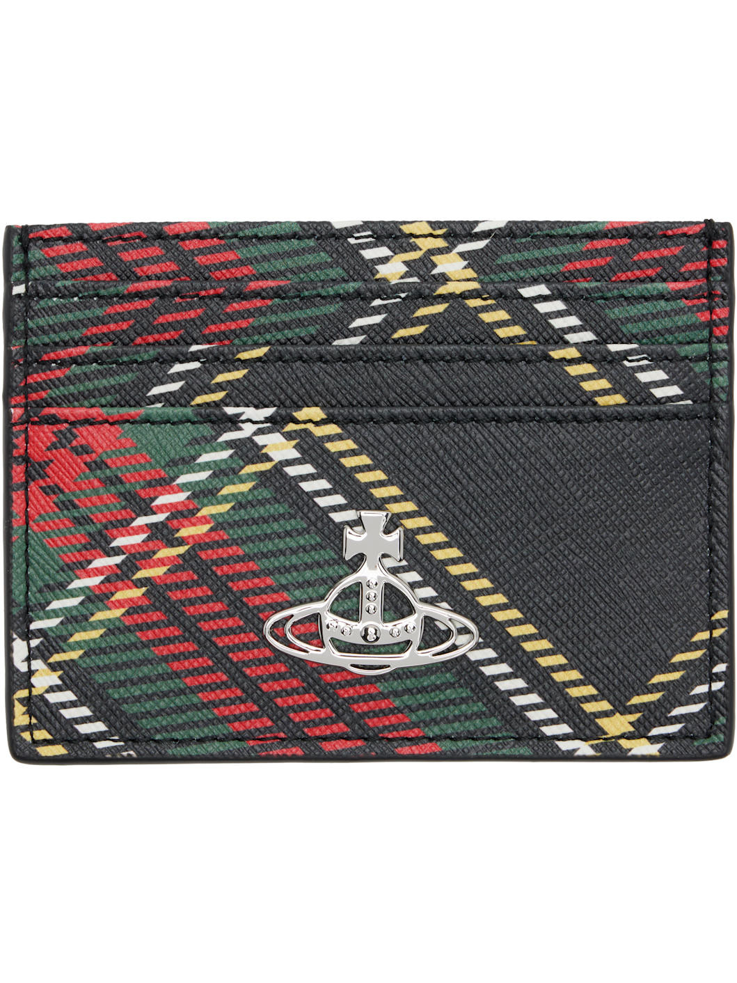 Saffiano faux-leather card holder. · Check pattern throughout · Logo hardware at face · Four card slots · Central note slot · Patterned textile lining · H3" x W4" Supplier color: Chelsea Tartan Synthetic. Made in Italy 252314M163046