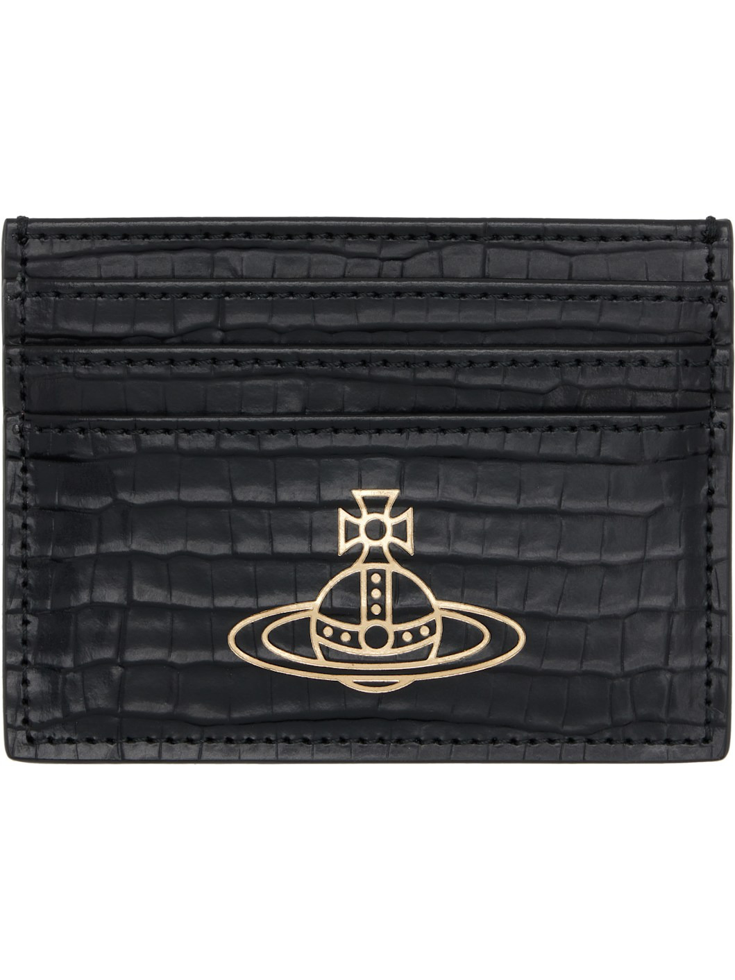 Croc-embossed calfskin card holder. · Gold-tone logo stamp at face · Four card slots · Central note slot · Twill lining · H3" x W4" Supplier color: Black Calfskin. Made in Italy 252314M163062