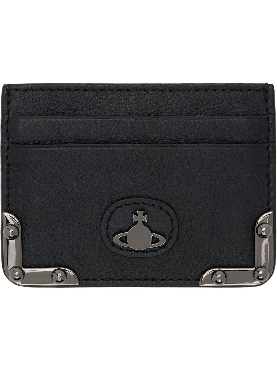 Grained leather card holder. · Logo hardware at face · Hardware at edges · Four card slots · Central note slot · Faille lining · Gunmetal-tone hardware · H3" x W4" Supplier color: Black/Gunmetal Leather. Made in Italy 252314M163064