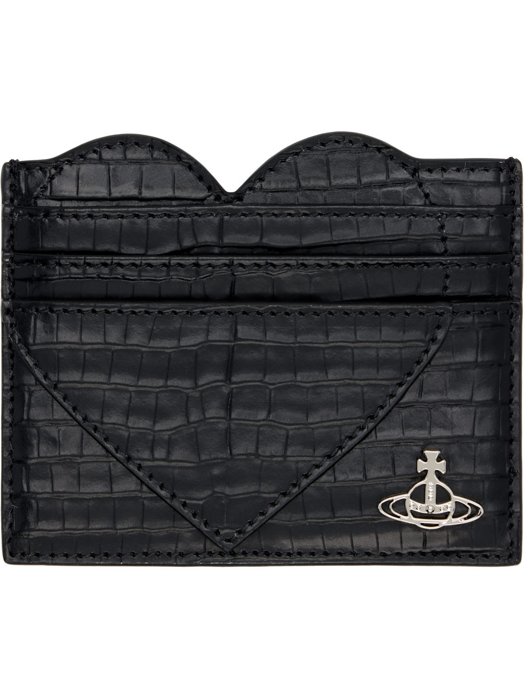 Croc-embossed calfskin card holder. · Heart-shaped applique and logo hardware at face · Three card slots · Central note slot · Twill lining · Silver-tone hardware · H3.25" x W4" Supplier color: Black Calfskin. Made in Italy 252314M163059