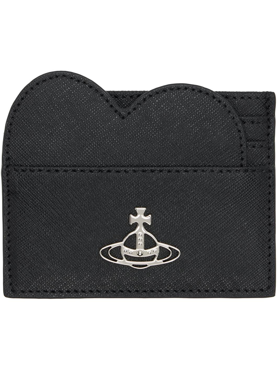 Saffiano leather card holder. · Heart-shaped applique and logo hardware at face · Four card slots · Central note slot · Twill lining · Silver-tone hardware · H3" x W4" Supplier color: Black Leather. Made in Italy 252314M163002