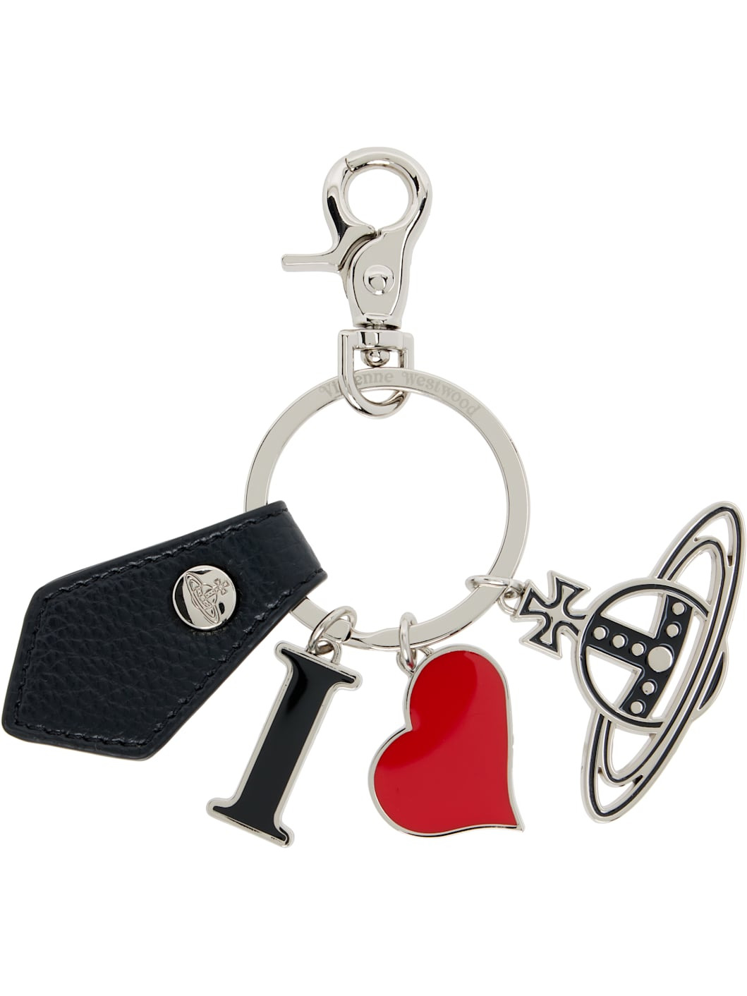 Keychain in silver tone. · Enameled logo and graphic charms at drop · Grained faux-leather logo tab · Key ring and lobster-clasp fastening · Logo-engraved silver-tone hardware · H6.25" x W2.75" Supplier color: Black Synthetic, metal. Made in Italy 252314M148008
