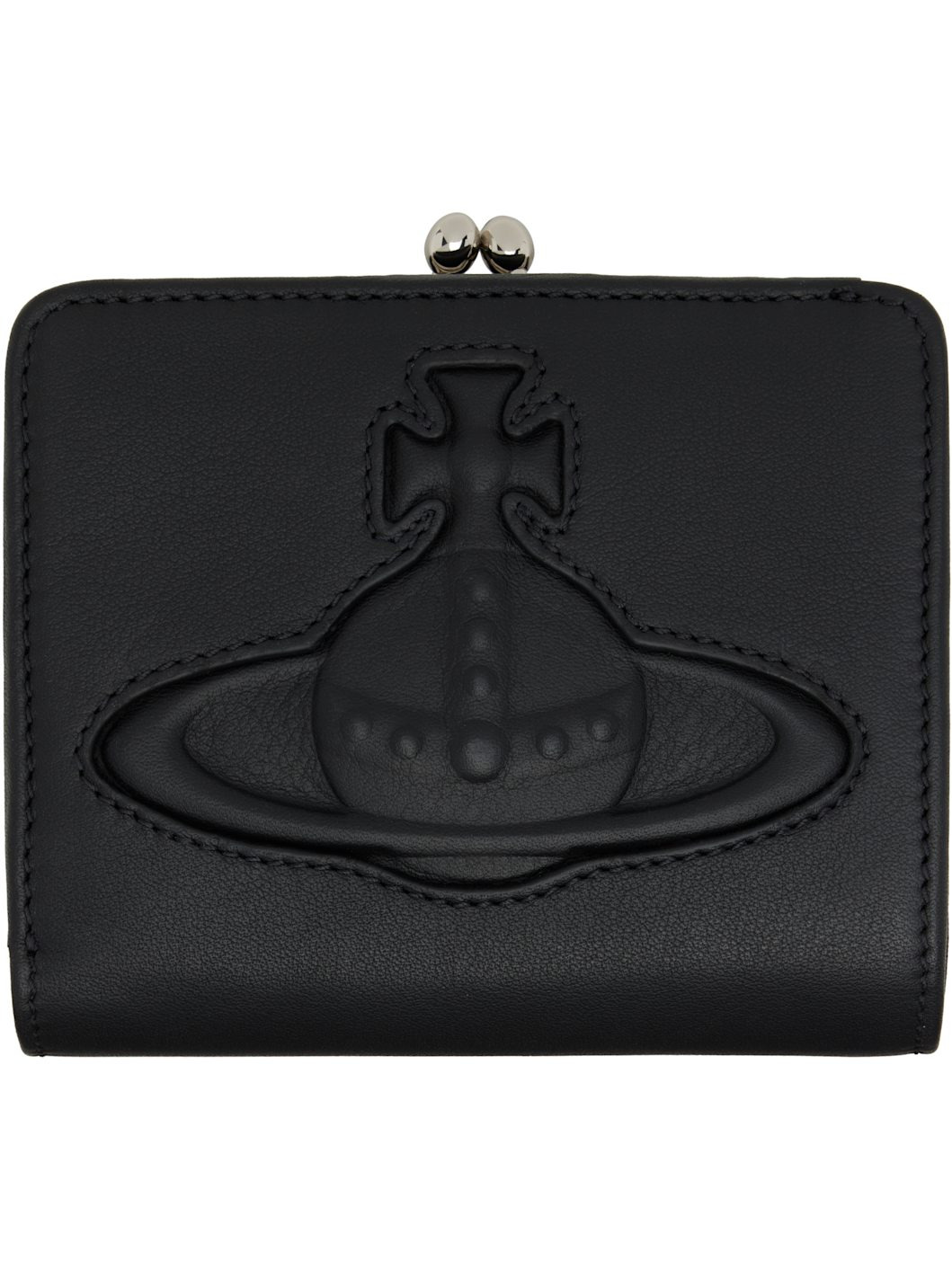 Buffed leather bifold wallet. · Logo embossed at face · Kiss-lock two-compartment coin pouch at back face · Press-stud closure at main compartment · Six card slots at interior · Three patch pockets · One note slot with two card slots · Twill lining · H3.75" x W4.5" x D1" Supplier color: Black Leather. Made in Italy 252314M164006