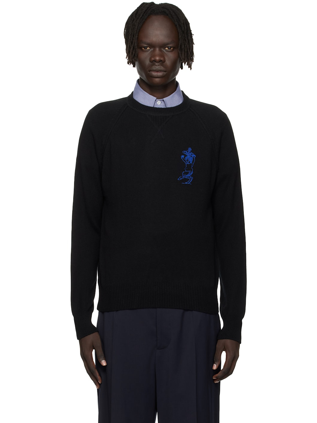 Knit organic cotton-blend sweater. · Rib-knit crewneck, hem, and cuffs · Logo and graphic embroidered at chest · Raglan sleeves Supplier color: Black 85% cotton, 15% cashmere. Made in Italy 252314M201006