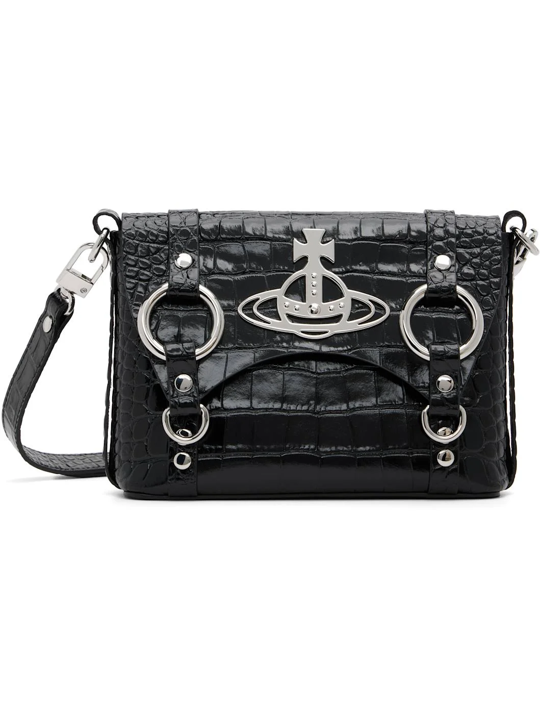Croc-embossed polished calfskin messenger bag. · Rivets throughout · Adjustable and detachable crossbody strap · Logo hardware, D-rings, and O-rings at face · Magnetic flap closure · Zip pocket at interior · H6.5" x W8.5" x D2.5" Supplier color: Black Calfskin. Made in Italy 252314M170032