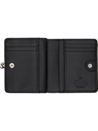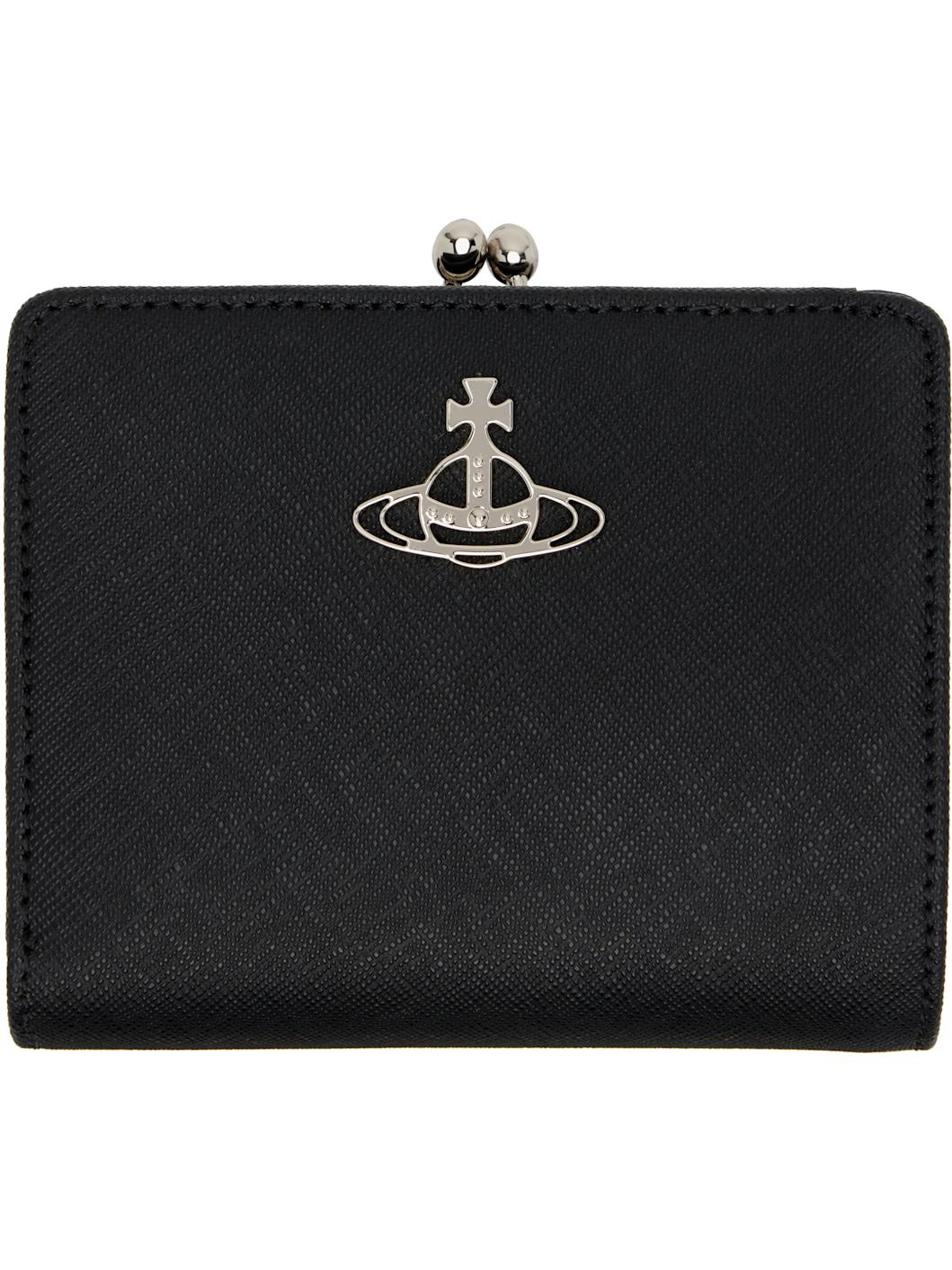 Saffiano leather bifold wallet. · Logo hardware at face · Press-stud flap closure · Kiss-lock coin pouch at back face · Six card slots at interior · Three patch pockets · One note slot · Twill lining · Silver-tone hardware · H3.75" x W4.5" x D1" Supplier color: Black Leather. Made in Italy 252314M164002