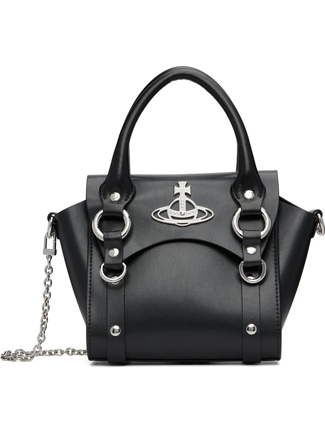 Buffed leather top handle bag. · Rolled carry handles · Detachable cable chain shoulder strap · Logo hardware, O-rings, and rivets at face · Magnetic press-stud flap · Card slot at interior · H6" x W6.75" x D3.5" Supplier color: Black Leather. Made in Italy 252314F046021