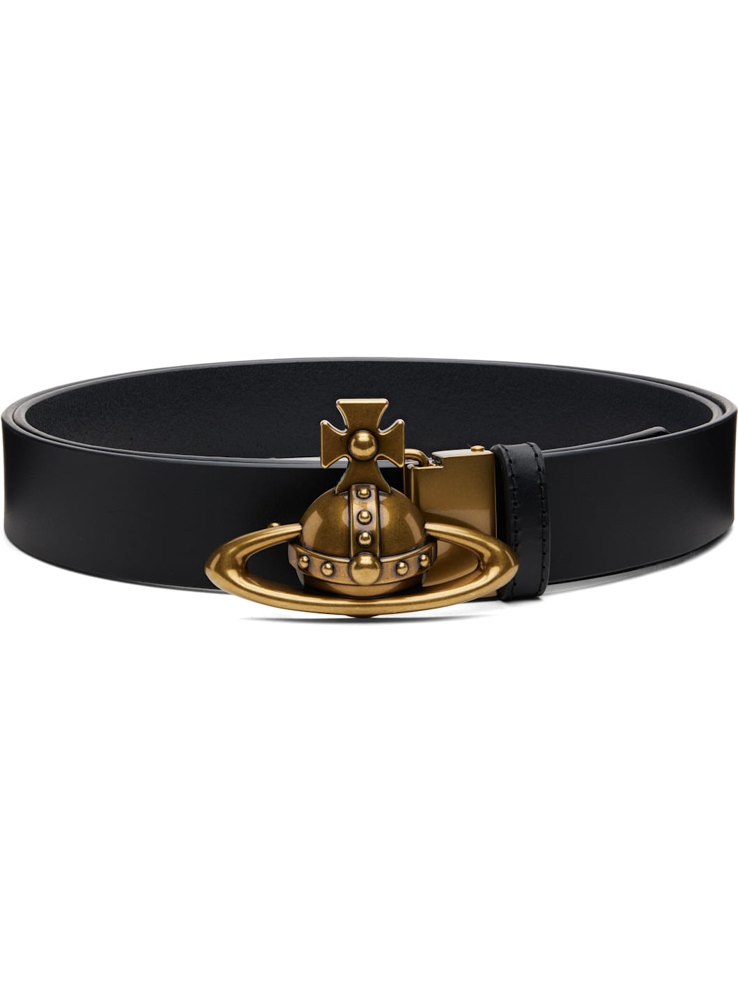 Buffed leather belt. · Keeper loop · Logo hardware post-stud fastening · Antiqued gold-tone hardware · W1.25" Supplier color: Black Leather. Made in Italy 252314M131002