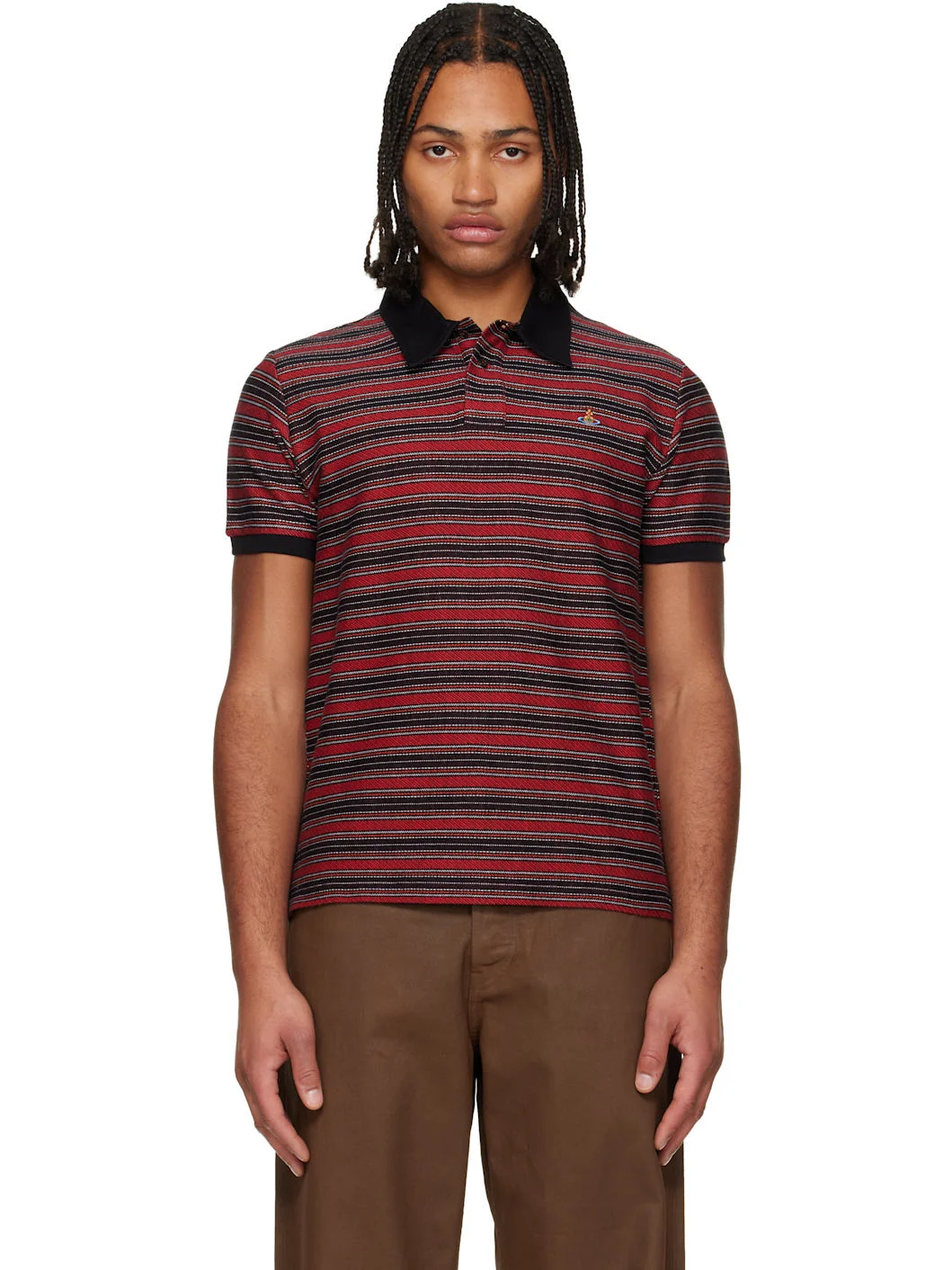 Knit cotton polo. · Stripes throughout · Twill spread collar · Two-button placket · Logo embroidered at chest · Tennis-tail hem Supplier color: Red/Black 100% cotton. Made in Turkey 252314M212011