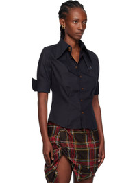 Cotton poplin shirt. · Darts throughout · Pointed collar · Button closure · Embroidered logo at chest · Shirttail hem · Rolled buttoned barrel cuffs Supplier color: Black Body: 100% cotton. Trim: 70% viscose, 30% polyester. Made in Romania 252314F109003