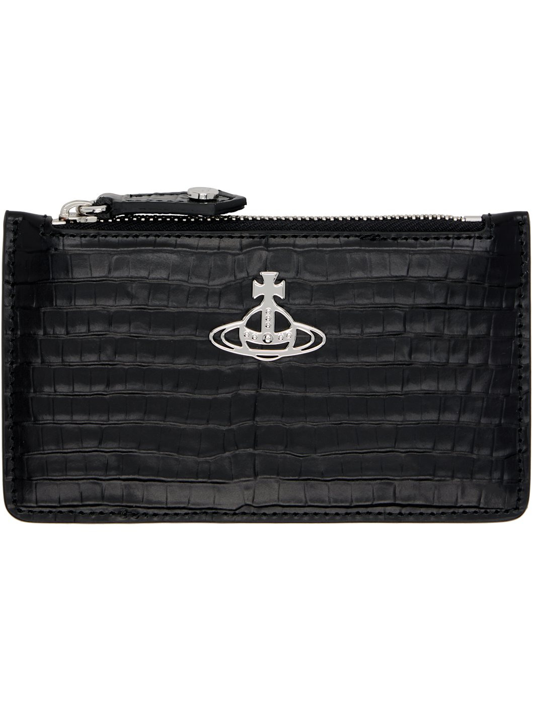 Croc-embossed calfskin card holder. · Logo hardware at face · Four card slots at back face · Zip closure · Faille lining · Silver-tone hardware · H3" x W5.5" Supplier color: Black Calfskin. Made in Italy 252314M163014