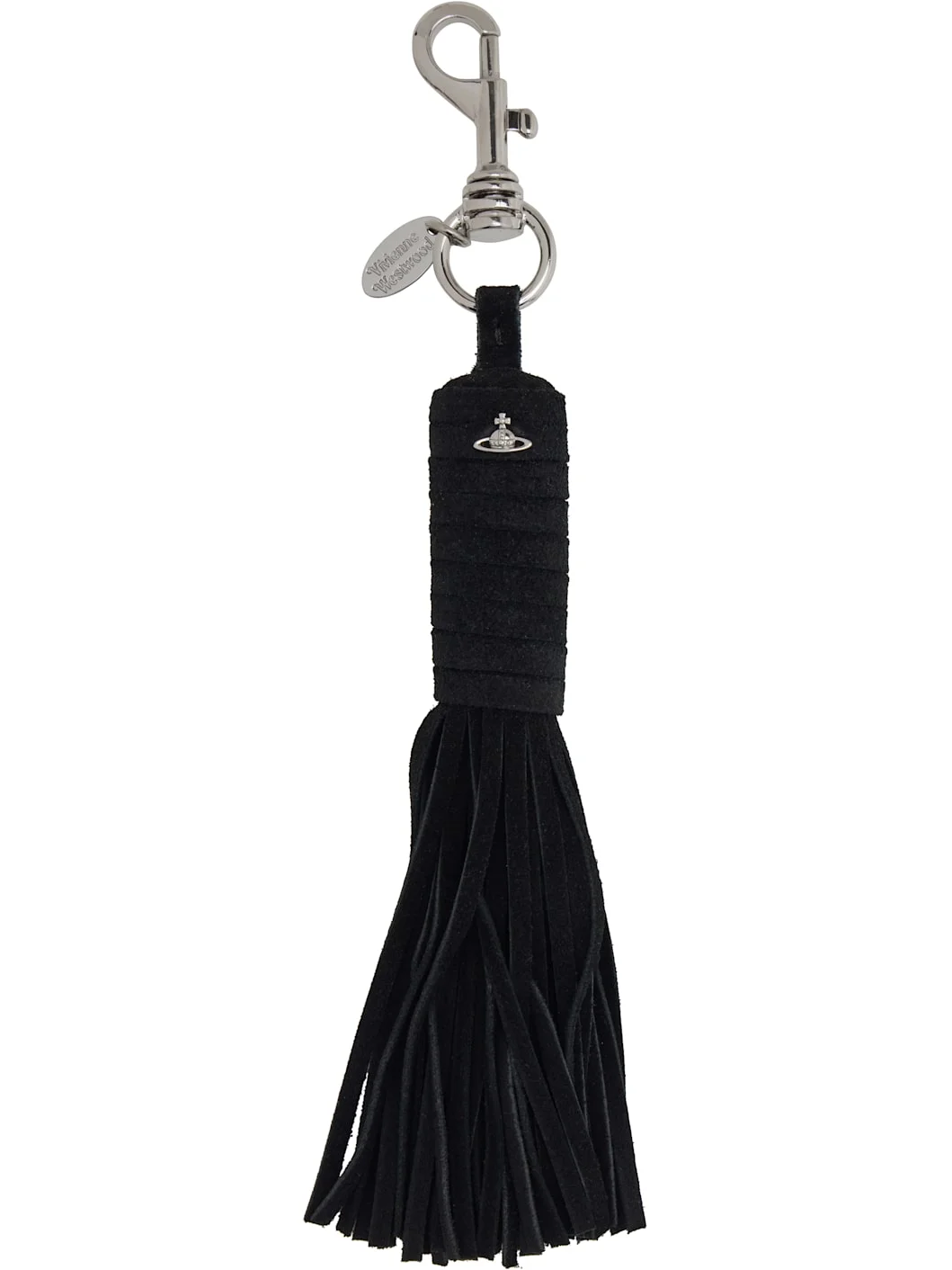 Calfskin suede keychain. · Lobster clasp and logo plaque at top · Logo hardware at face · H8.5" x W1" x D1" Supplier color: Black Calfskin. Made in Italy 261314M148011