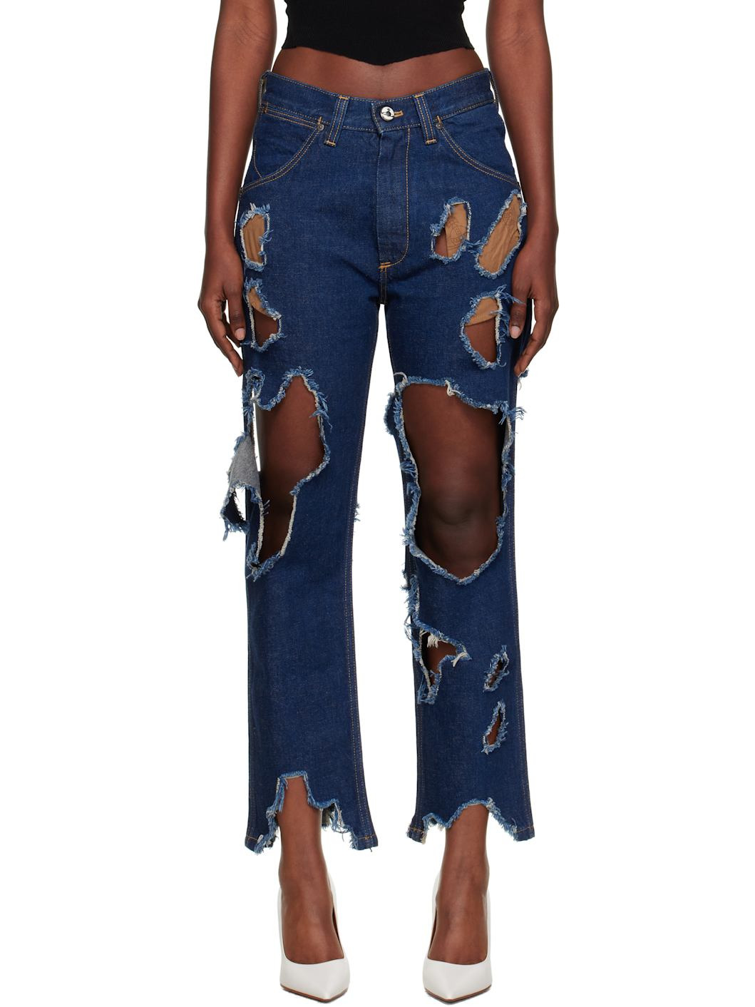 Non-stretch organic cotton- and linen-blend denim jeans. · Rips and cutouts throughout · High-rise · Belt loops · Five-pocket styling · Zip fly · Raw edge at cuffs · Embroidered logo graphic at back pocket · Contrast stitching in tan Supplier color: Indigo Body: 80% organic cotton, 20% linen. Pocket lining: 100% cotton. Made in Tunisia 251314F069004
