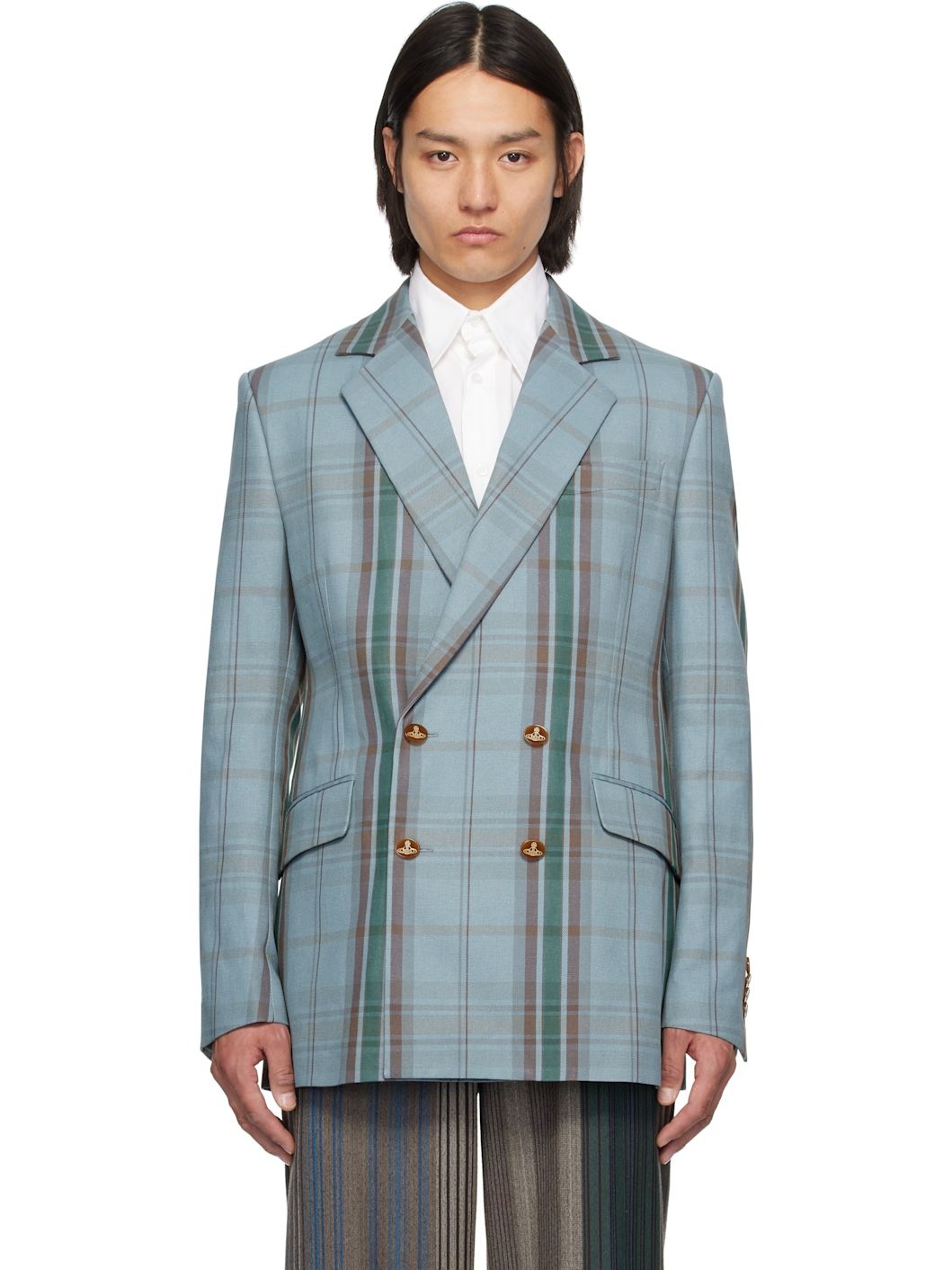 Cotton- and linen-blend twill blazer. Check pattern throughout. · Notched lapel · Double-breasted button closure · Welt pocket and flap pockets · Padded shoulders · Surgeon's cuffs · Twin vents at back hem · Welt pocket at interior · Full logo-woven satin lining · Logo-engraved hardware Supplier color: Multicolor Body: 80% cotton, 20% linen. Lining: 100% viscose. Made in Italy 251314M195007