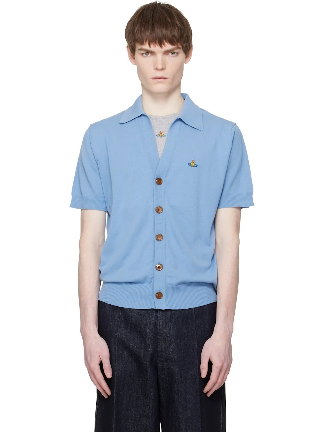 Knit organic cotton cardigan. · Rib-knit spread collar, Y-neck, hem, and cuffs · Button closure · Logo embroidered at chest Supplier color: French blue 100% cotton. Made in Italy 261314M200005